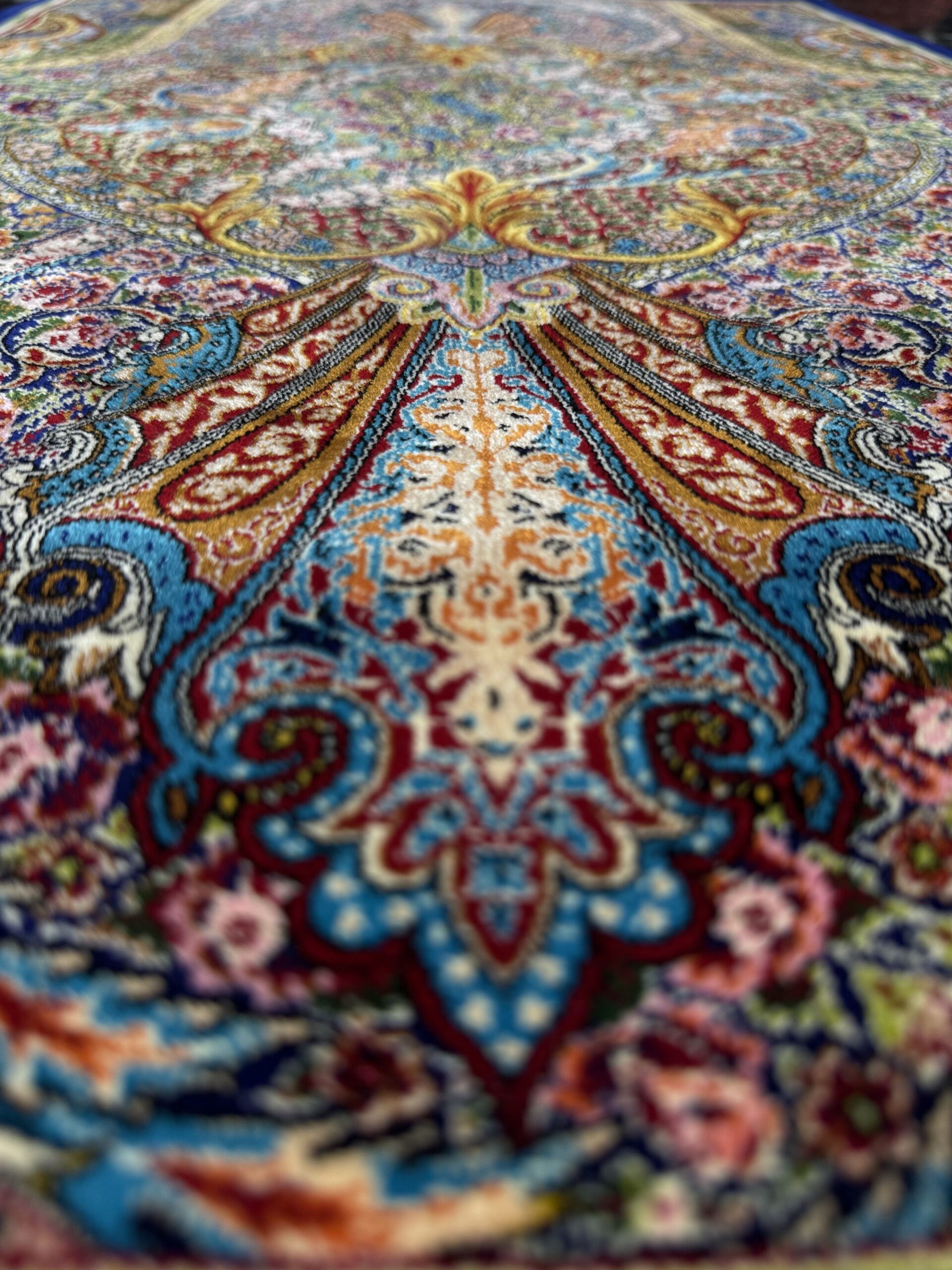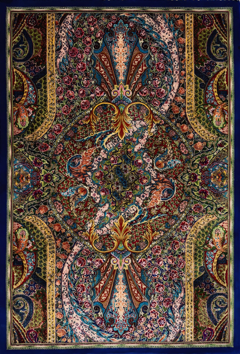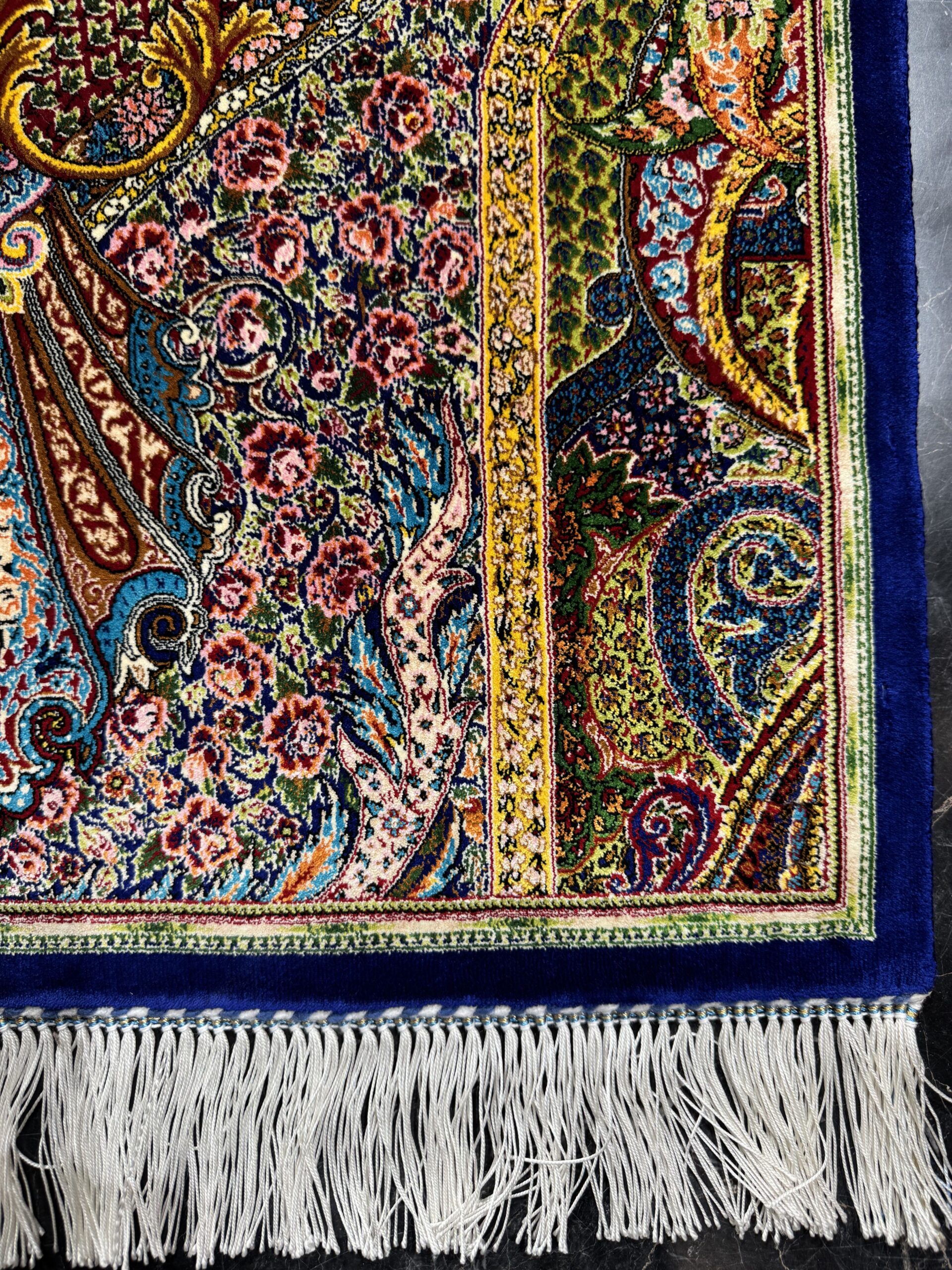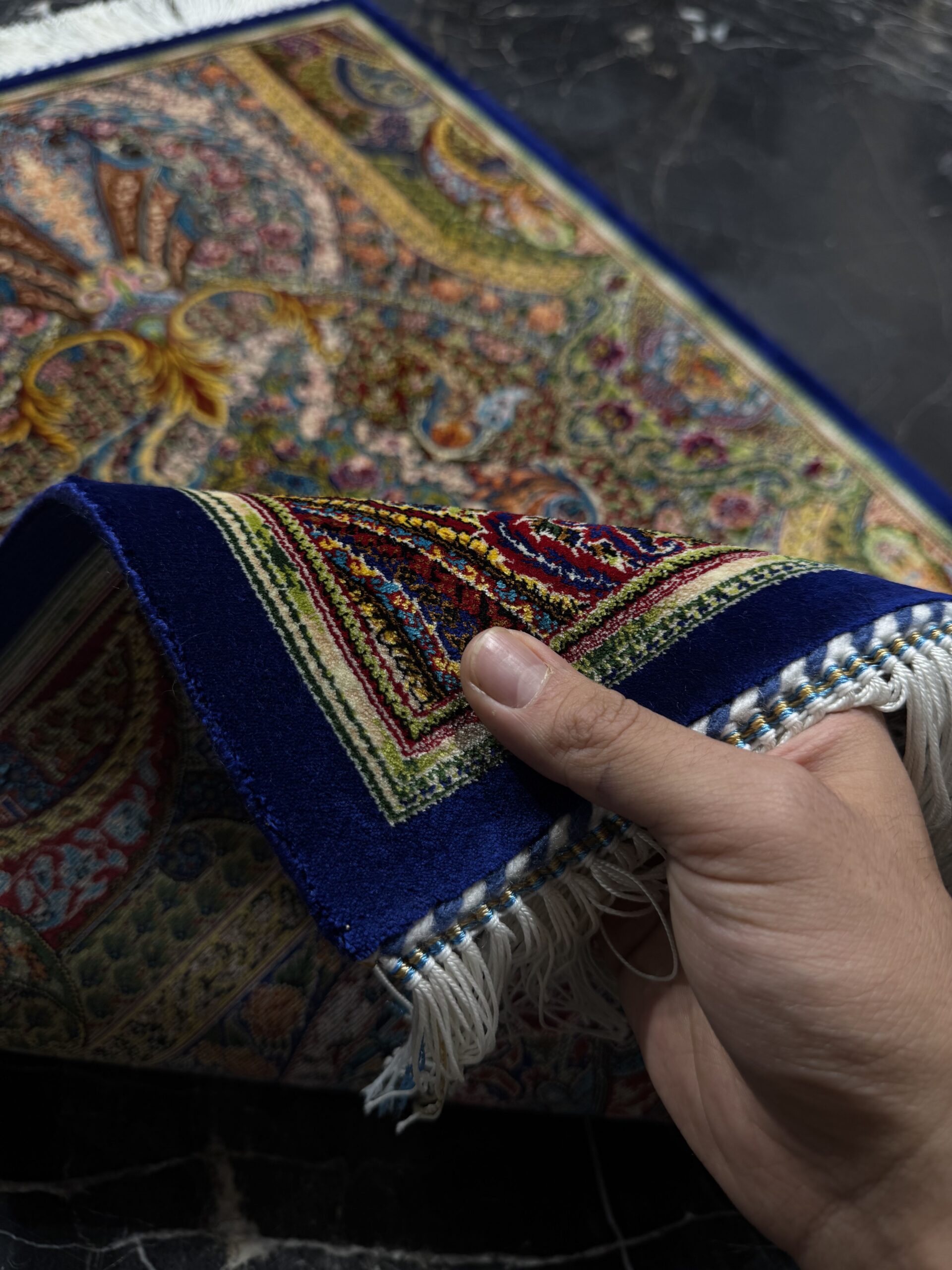 ربات بافت قم 60 * 90 مستطيل لچک ترنجي ارمي 70 رج ابريشم و بنبوسيلک الوان سورمه ايي Kg 1