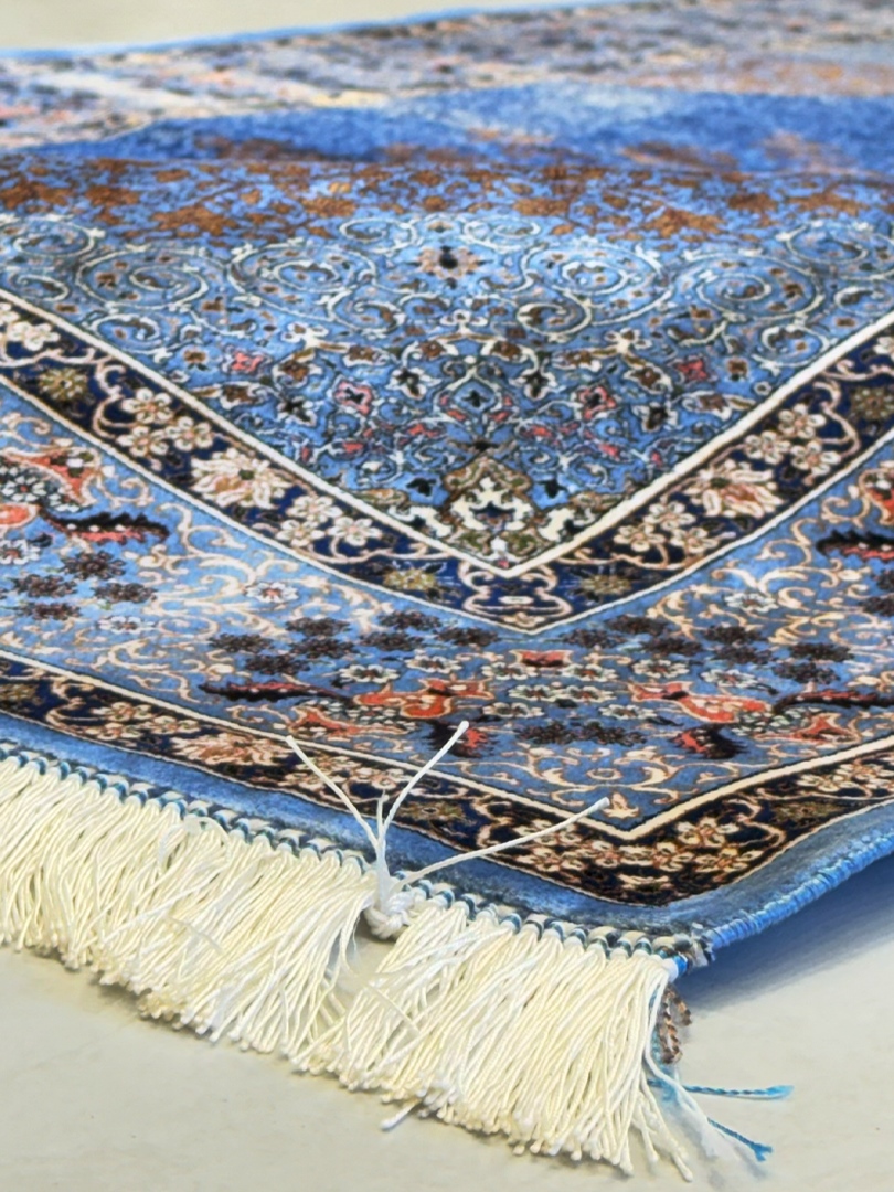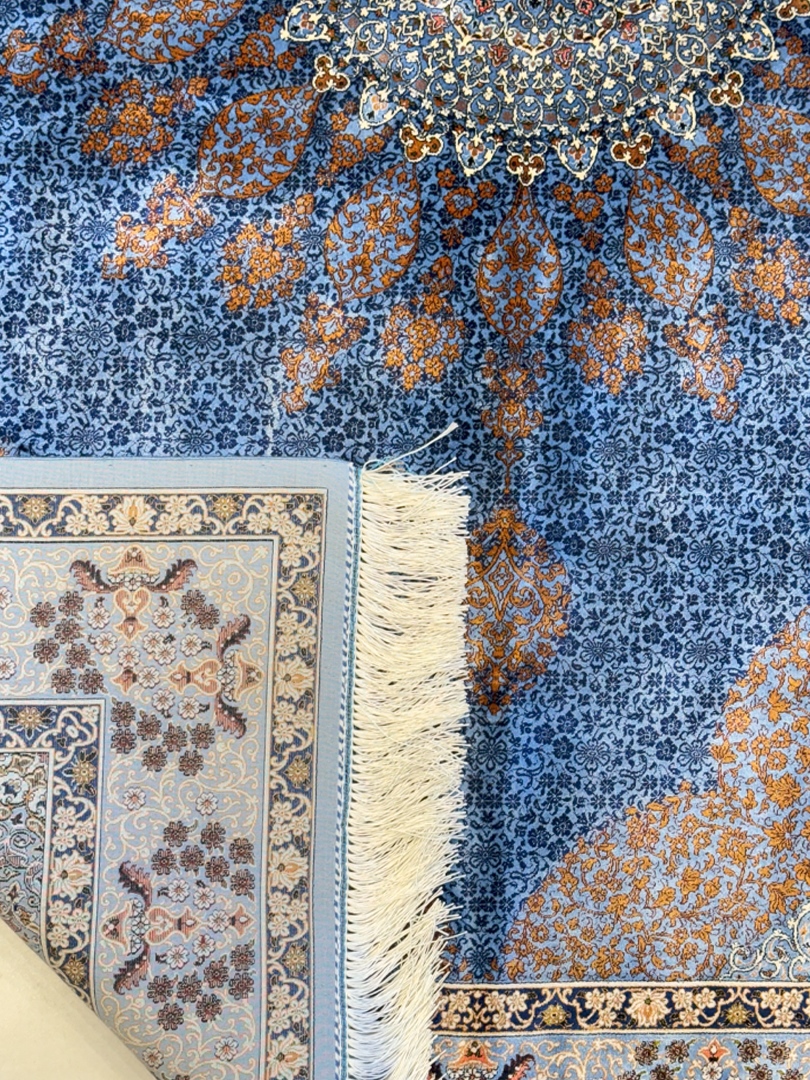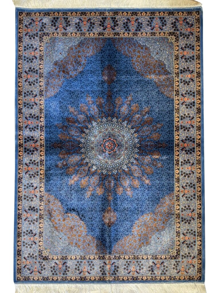ربات بافت قم 120*180 مستطيل لچک ترنجي پتينه بافي 70 رج ابريشم و بنبوسيلک ابي کاربني ابي 5 Kg