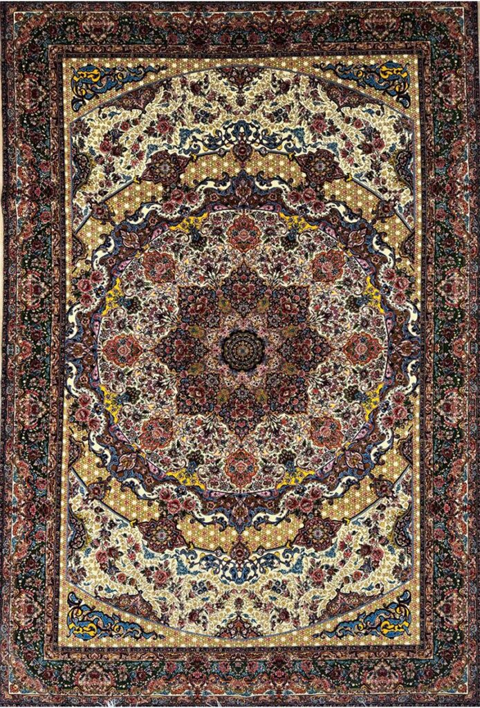 ربات بافت قم 120*180 مستطيل لچک ترنجي 70 رج ابريشم و بنبوسيلک کرم و بژ کرم و سبز 9 Kg