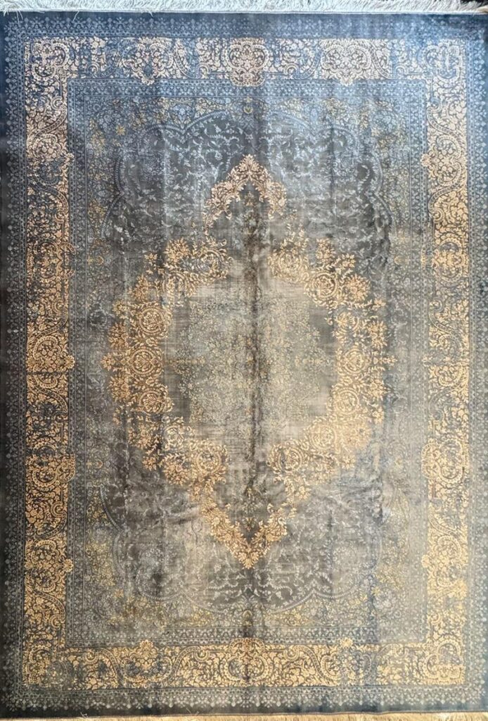 ربات بافت تمام ابريشم 2 نخ 250*350 مستطيل لچک ترنجي مدرن 70 رج ابريشم و بنبوسيلک طوسي کرم طوسي 30 Kg