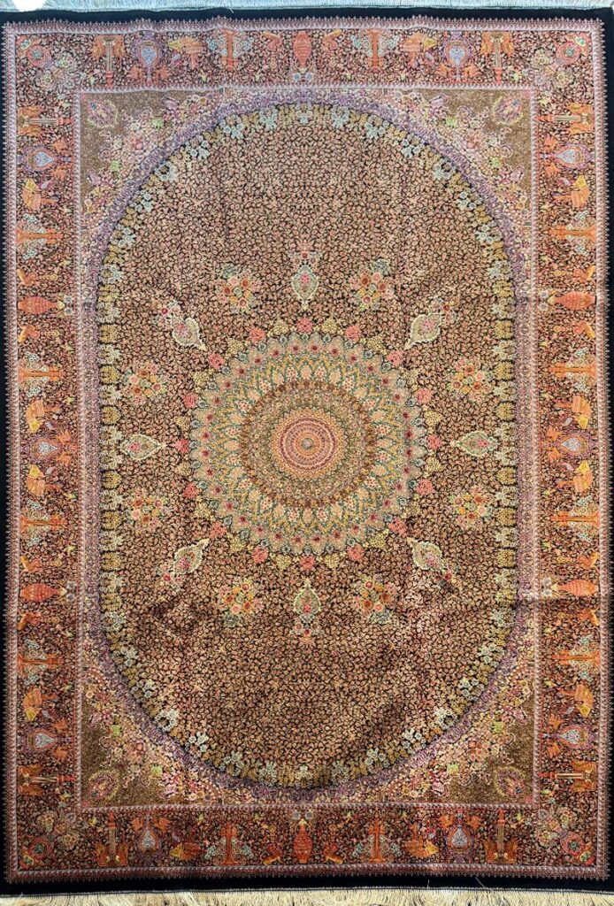 ربات بافت قم 150*225 مستطيل لچک ترنجي گلريز 70 رج ابريشم و بنبوسيلک مشکي گلبهي مشکي 13 Kg