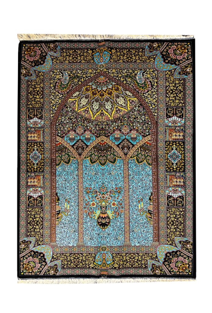 ربات بافت قم 100*150 مستطيل محرابي گلداني 70 رج ابريشم و بنبوسيلک آبي مشکي 3 Kg