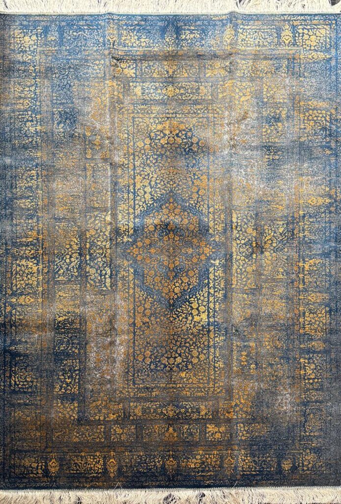 ربات بافت مدرن 220*150 مستطيل مدرن 70 رج پشم و بنبوسيلک آبي کرم و طلايي 12 Kg