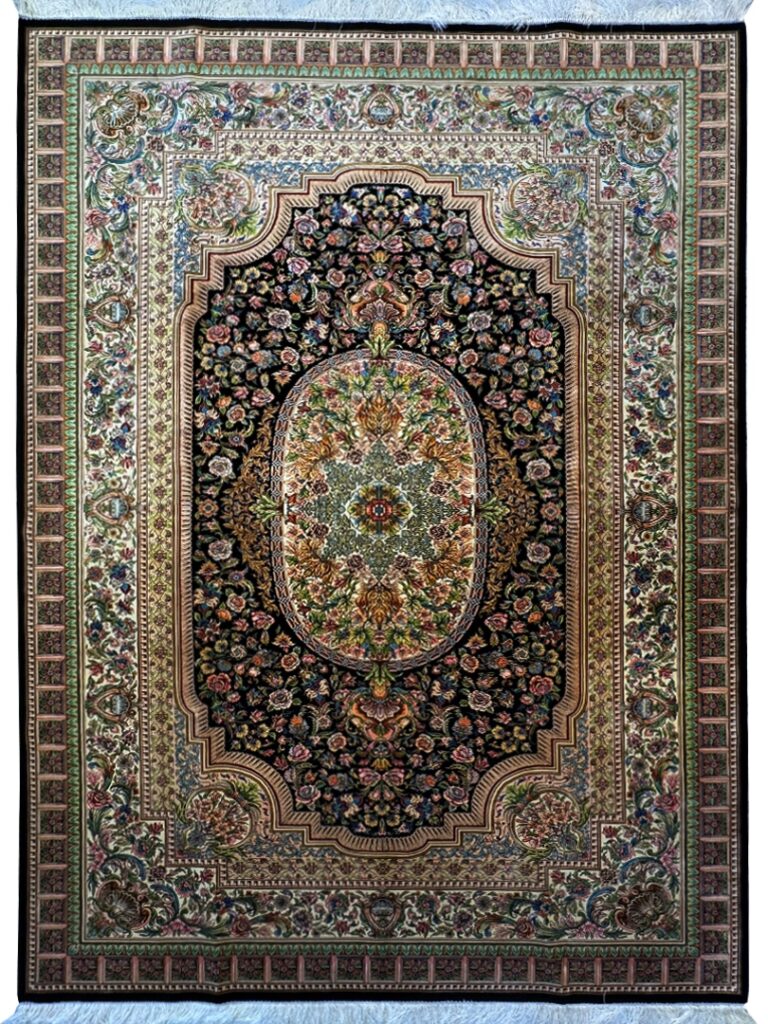 ربات بافت قم 200*300 مستطيل ارمي 70 رج ابريشم و بنبوسيلک مشکي کرم کرم الوان 12 Kg