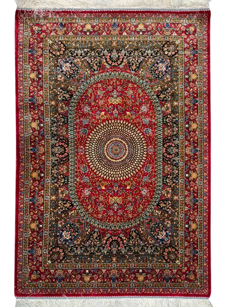 ربات بافت قم 80*120 مستطيل اسليمي 70 رج ابريشم و بنبوسيلک شرابي شرابي 2 Kg