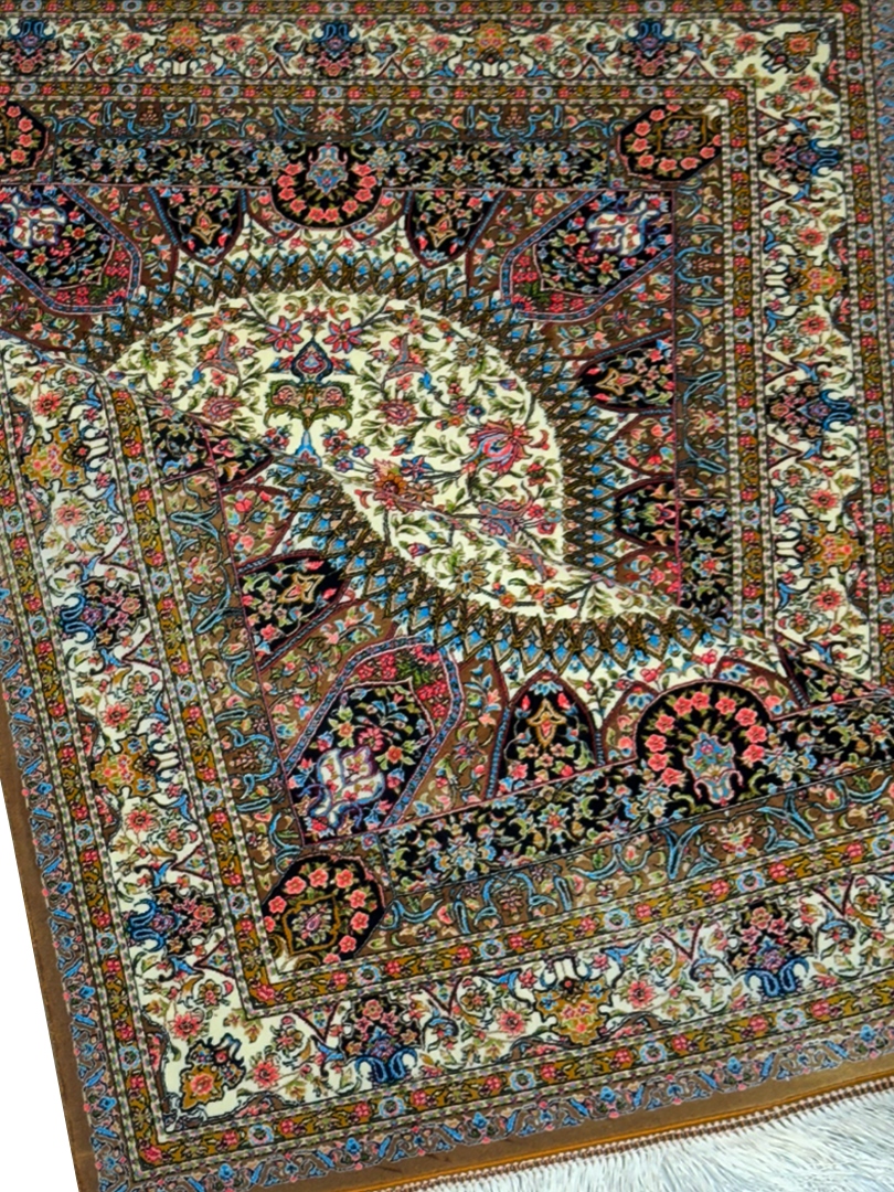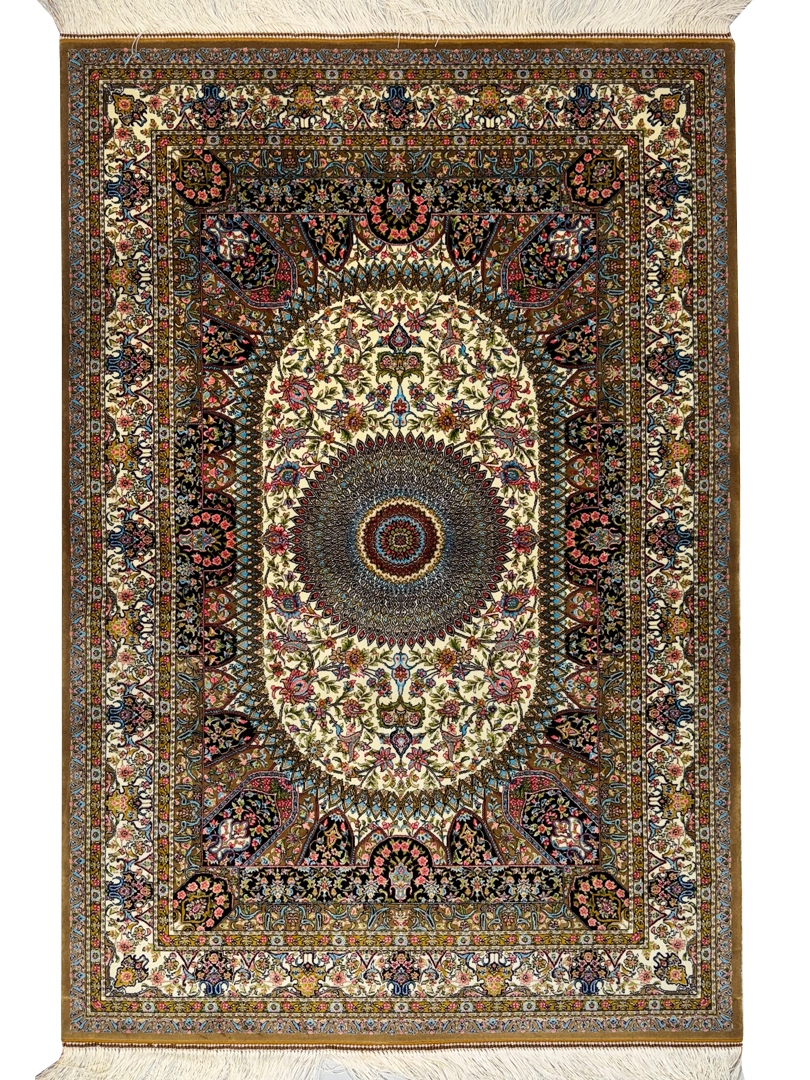 ربات بافت قم 80*120 مستطيل اسليمي 70 رج ابريشم و بنبوسيلک کرم الوان نسکافه‌اي kg1
