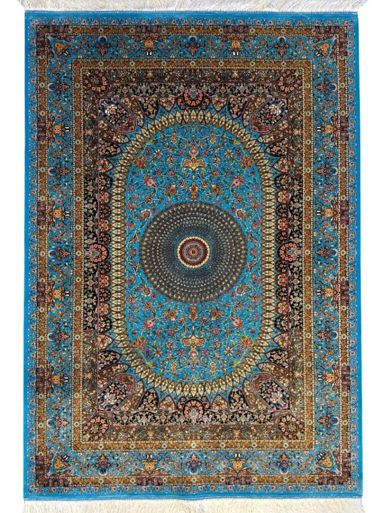 ربات بافت قم 100*150 مستطيل اسليمي 70 رج پشم و بنبوسيلک ابي اسماني ابي اسماني 3 Kg