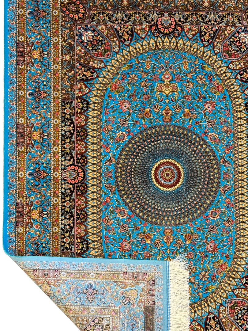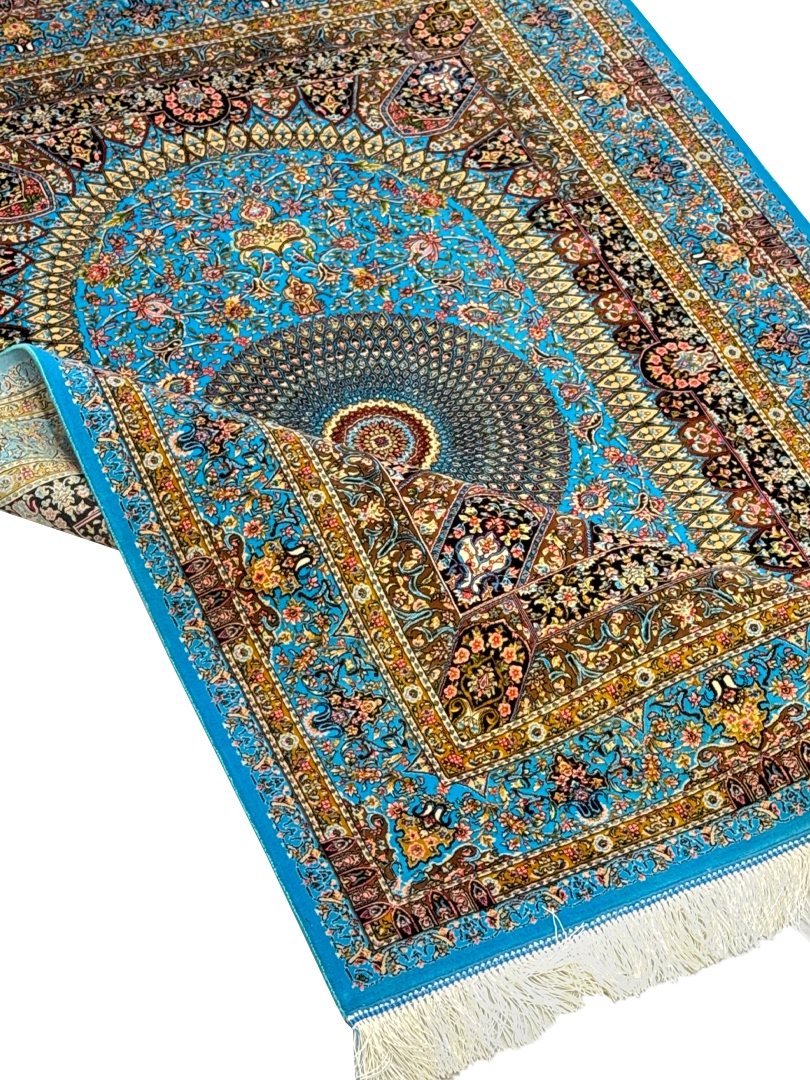 ربات بافت قم 100*150 مستطيل اسليمي 70 رج پشم و بنبوسيلک ابي اسماني ابي اسماني 3 Kg