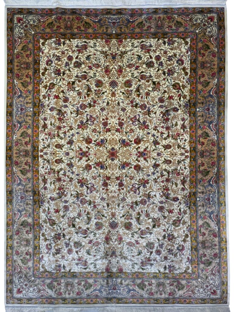 ربات بافت قم 200*300 مستطيل افشان شاه عباسي 70 رج ابريشم و بنبوسيلک کرم الوان نسکافهاي 12 Kg