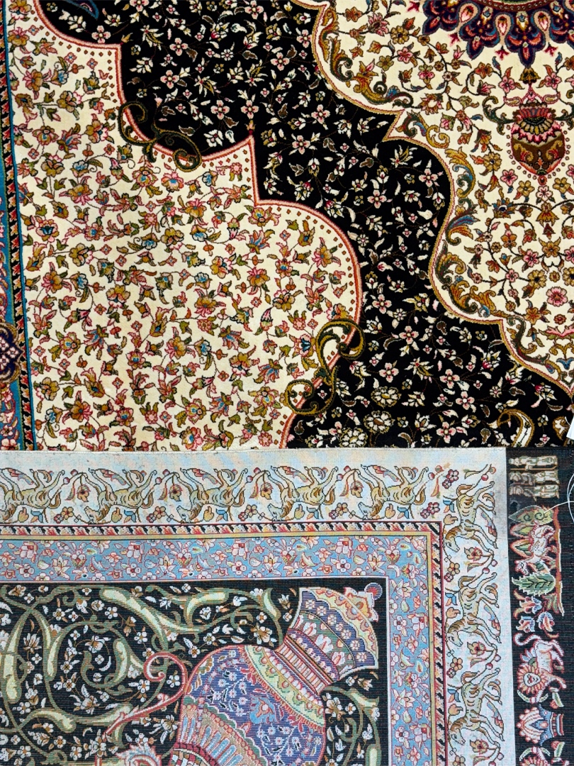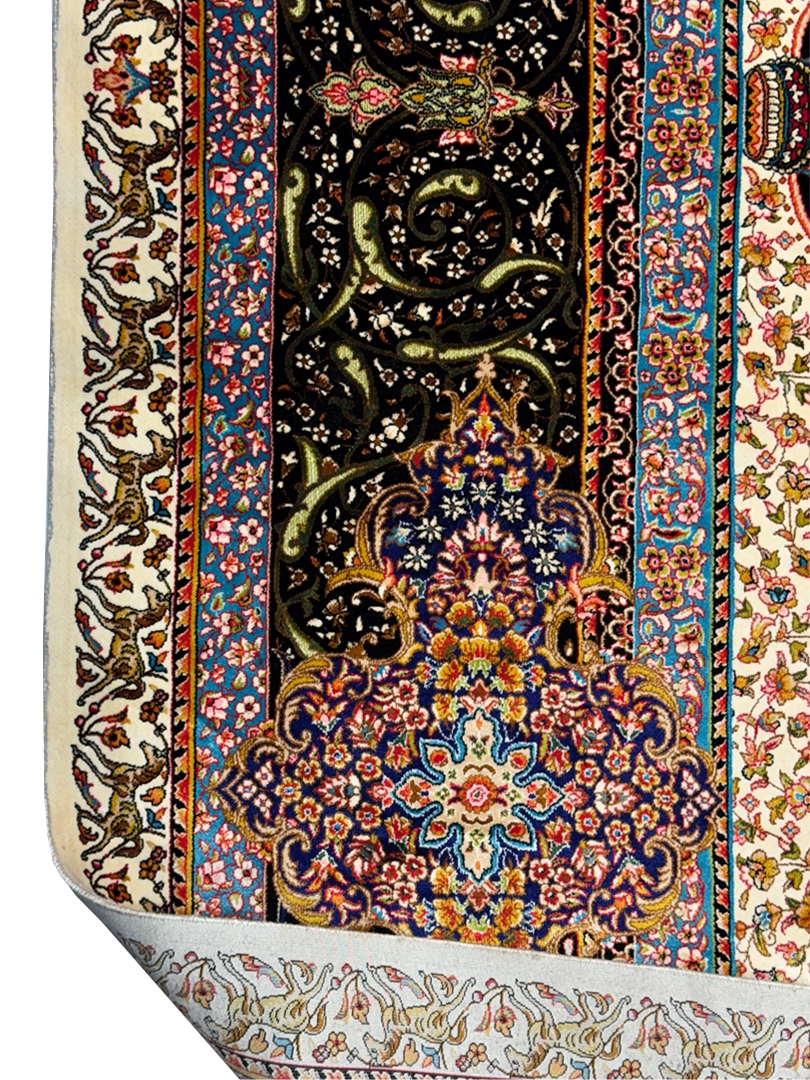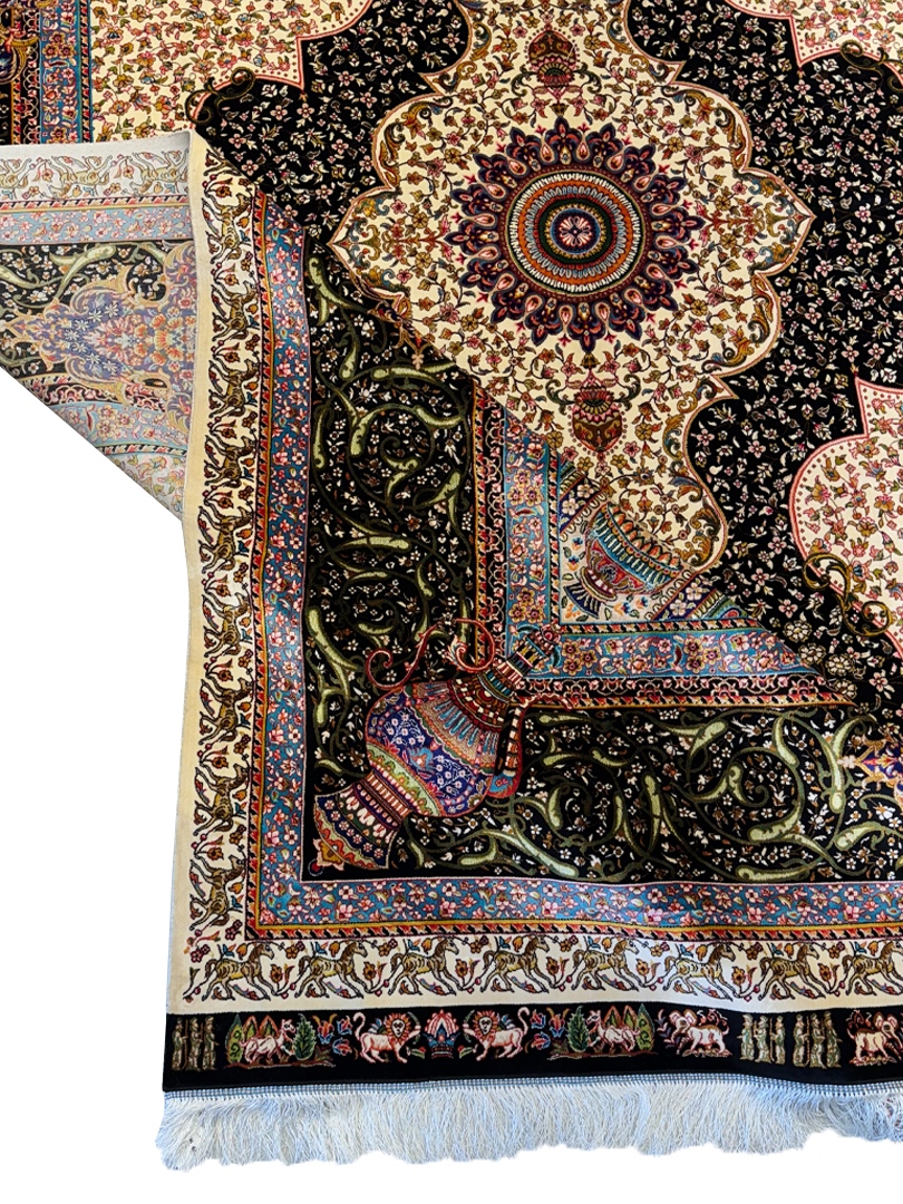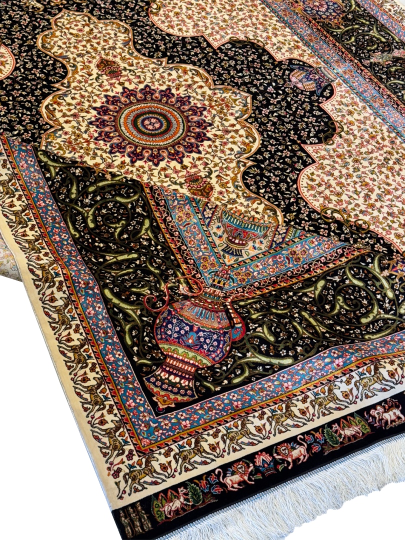 ربات بافت قم 200*300 مستطيل جمشيدي جديد 70 رج ابريشم و بنبوسيلک کرم مشکي الوان 12 Kg