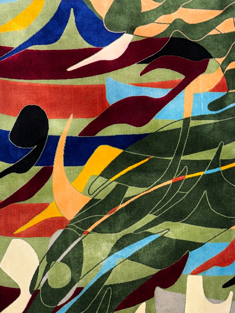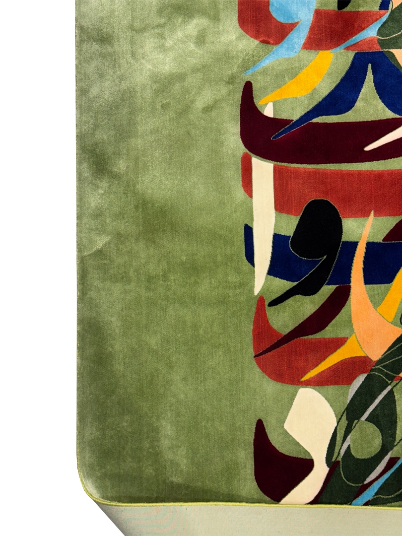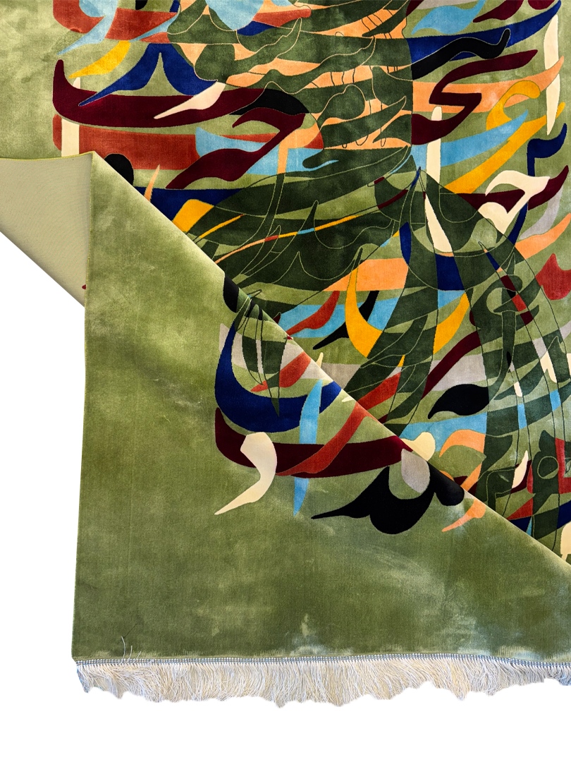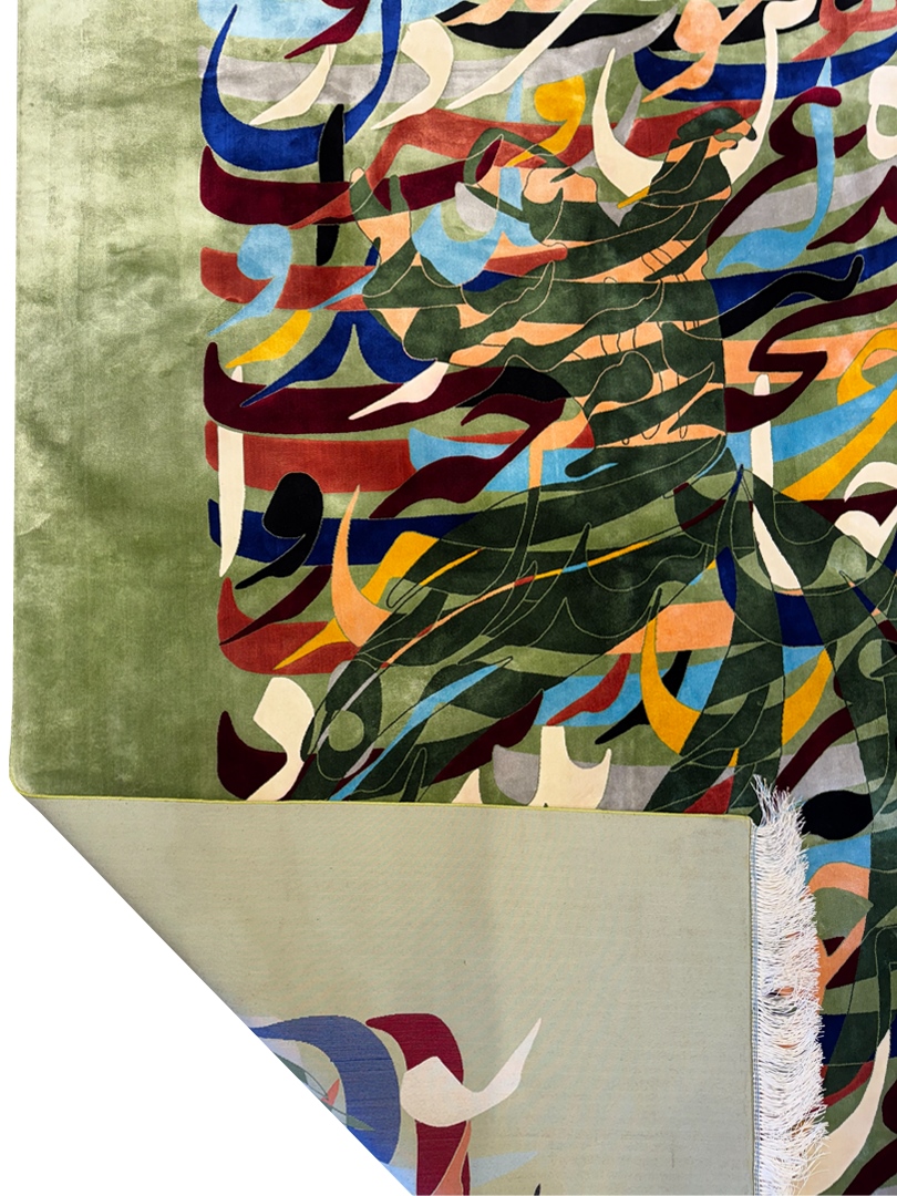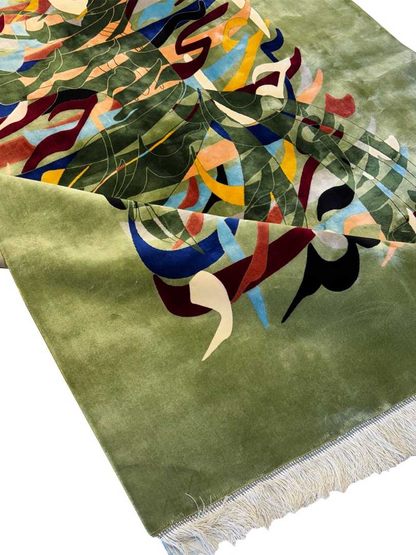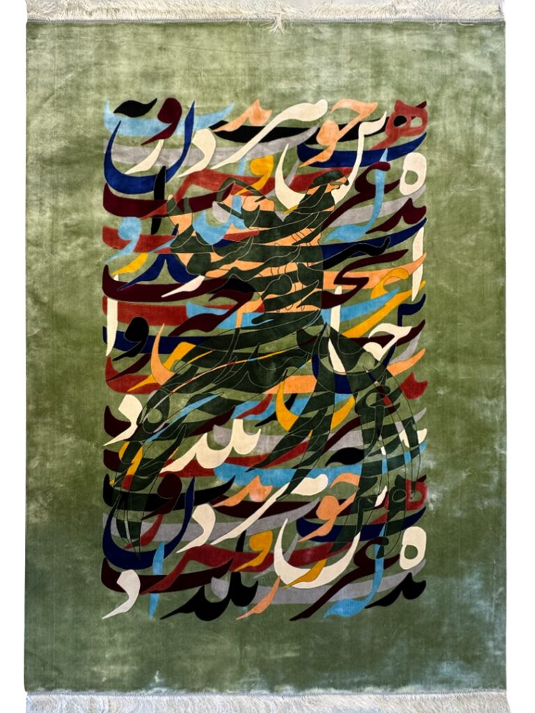 ربات بافت قم 150*225 مستطيل حروف 70 رج ابريشم و بنبوسيلک سبز پسته اي الوان 8 Kg