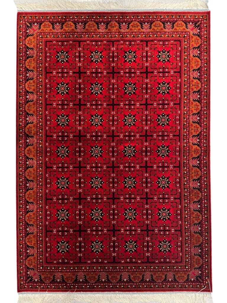 ربات بافت قم 100*150 مستطيل خان محمدي 70 رج ابريشم و بنبوسيلک لاکي کرم نارنجي 2 Kg