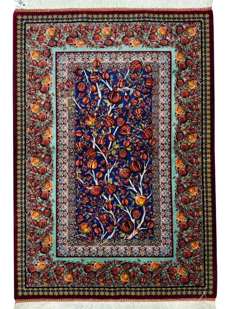 ربات بافت قم 80*120 مستطيل درخت انار 70 رج ابريشم و بنبوسيلک سورمه ايي عنابي شرابي kg1