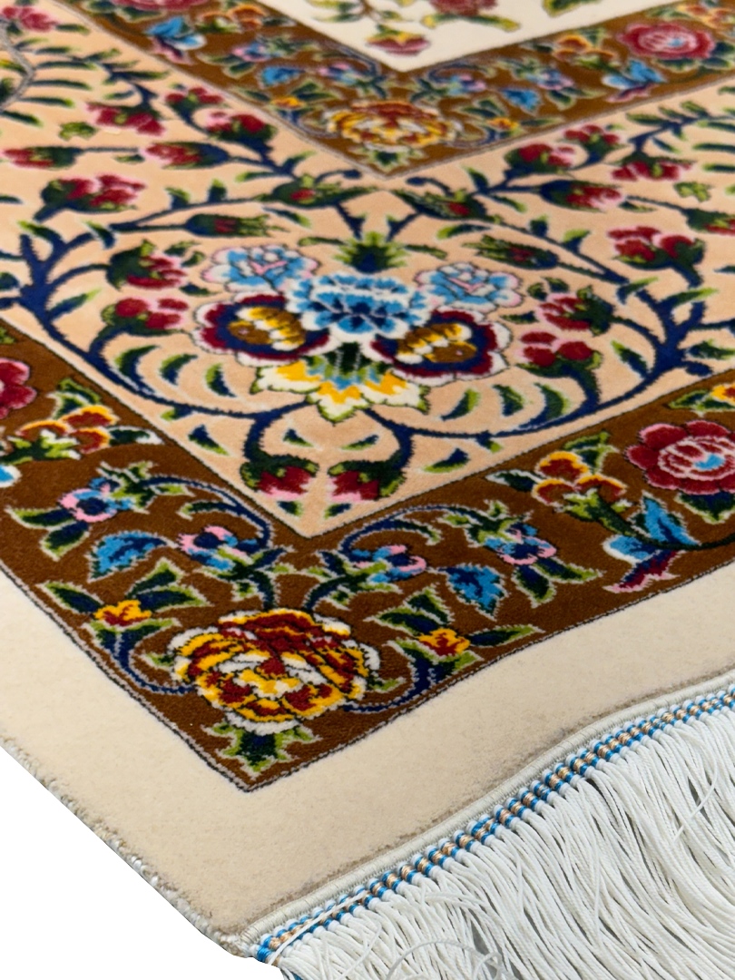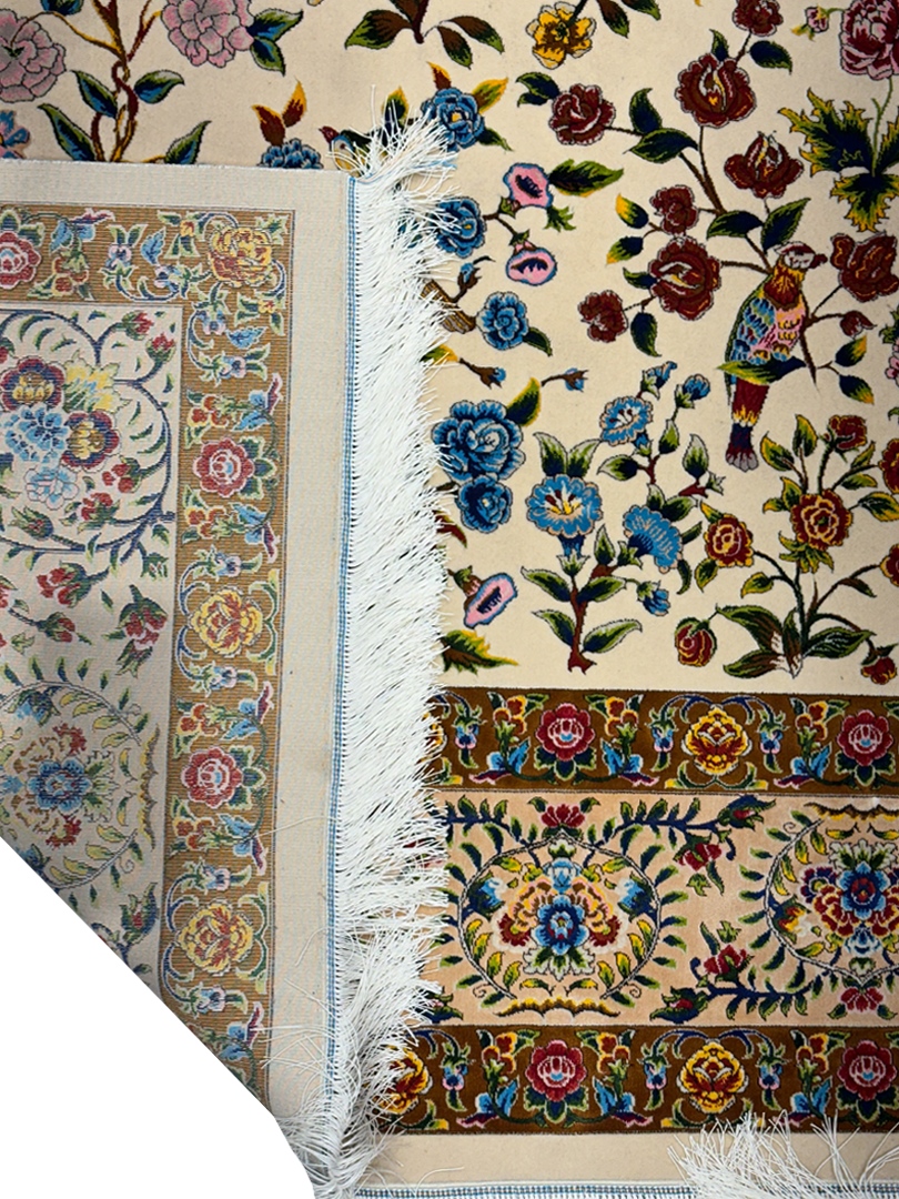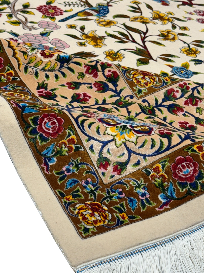 ربات بافت تبريز 200*300 مستطيل درخت زندگي هزار گل 70 رج پشم و ابريشم کرم دارچيني 17 Kg