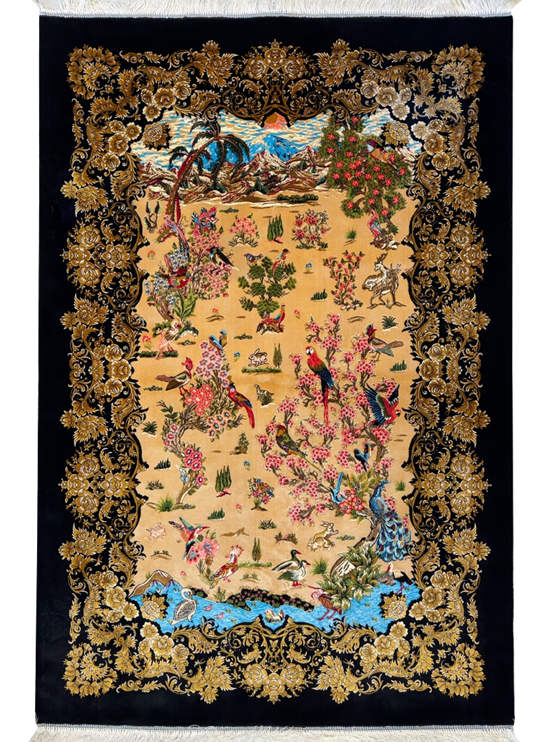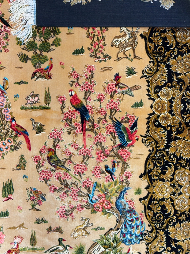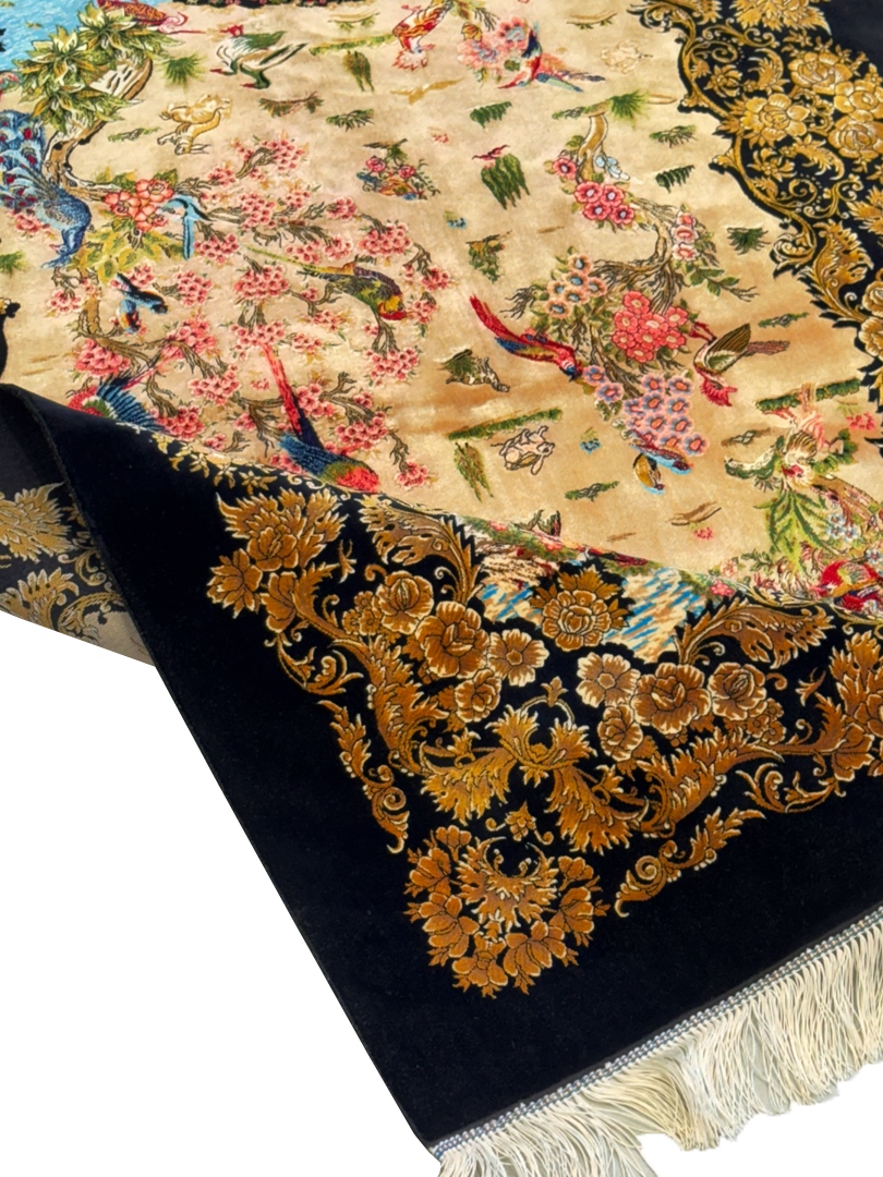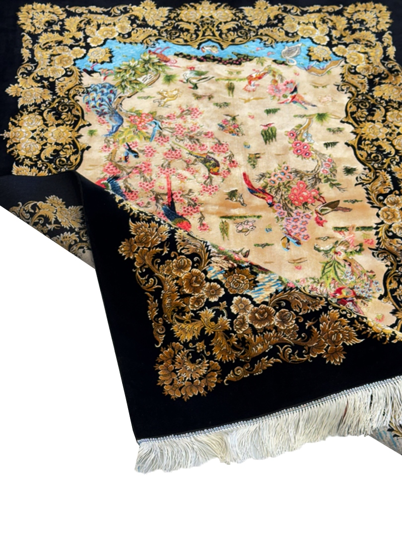 ربات بافت ربات ابريشم 100*150 مستطيل درخت زندگي 70 ابريشم و بنبوسيلک کرم مشکي 2 Kg