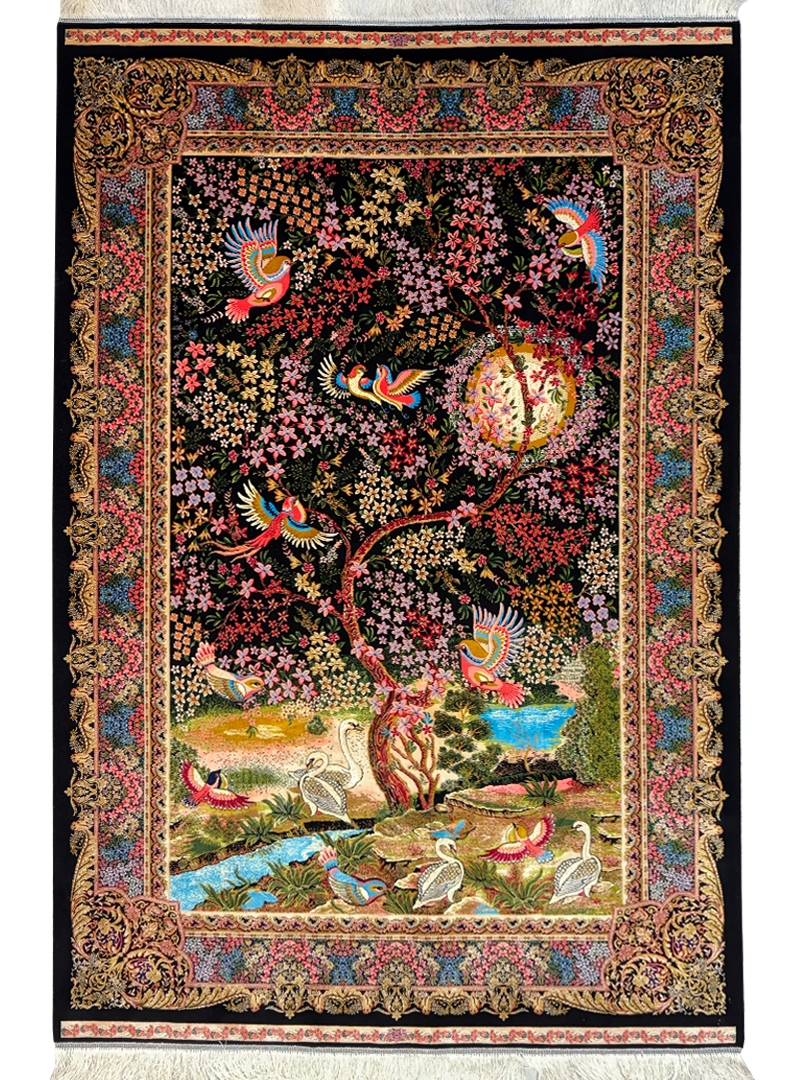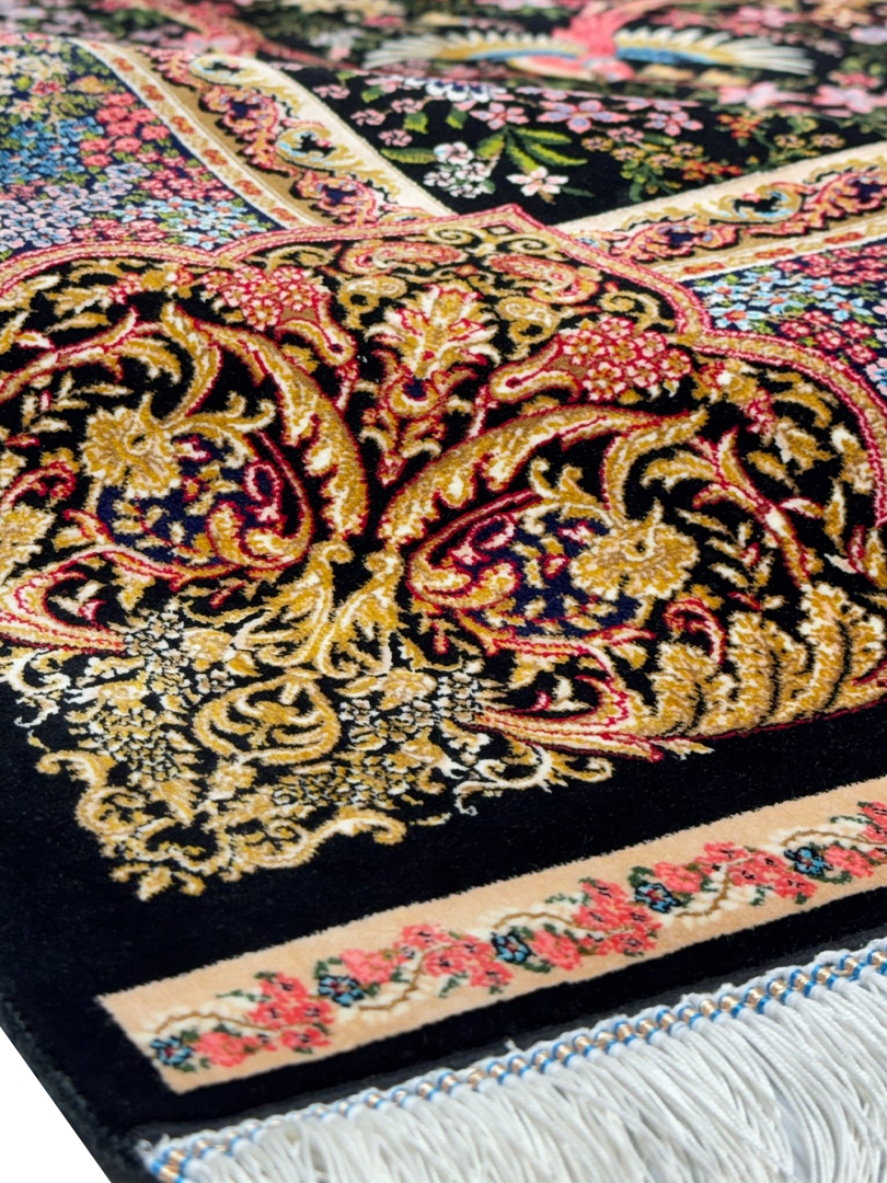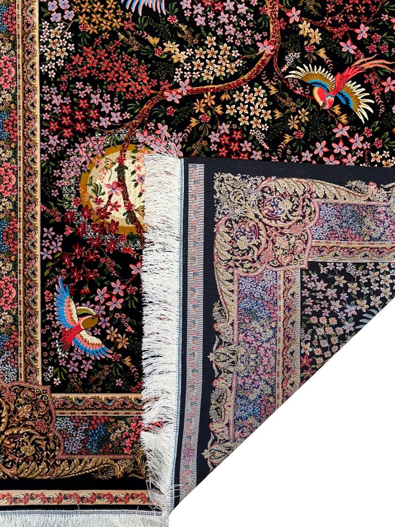 ربات بافت قم 80*120 مستطيل درخت زندگي 70 رج ابريشم و بنبوسيلک مشکي مشکي 5 Kg