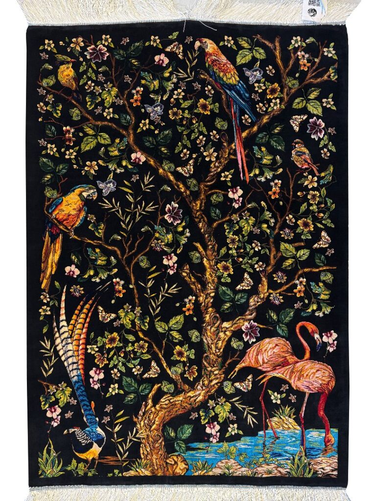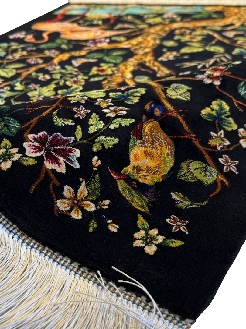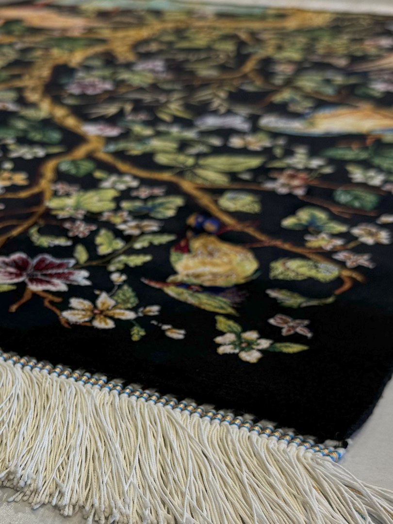 ربات بافت قم 80*120 مستطيل درخت زندگي 70 رج ابريشم و بنبوسيلک مشکي الوان 2 Kg