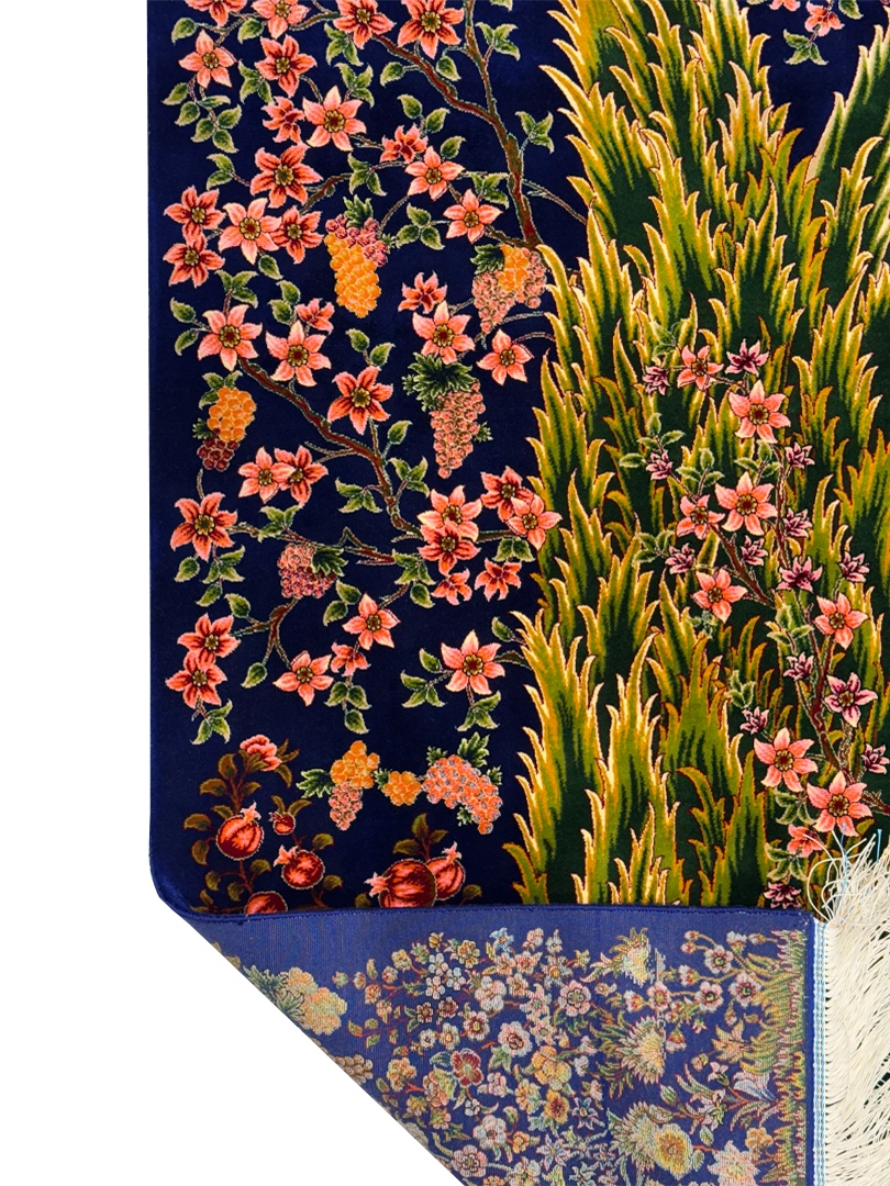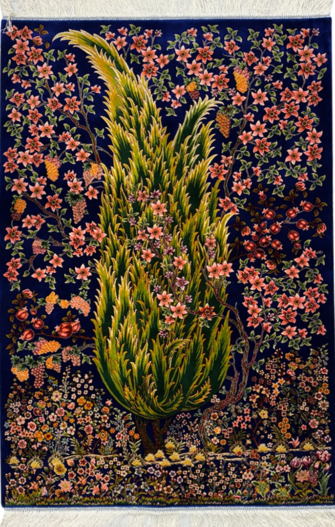 فرش ربات بافت مستطیل درخت سروی 70 رج ابریشم و بنبوسیلک کد 2003904