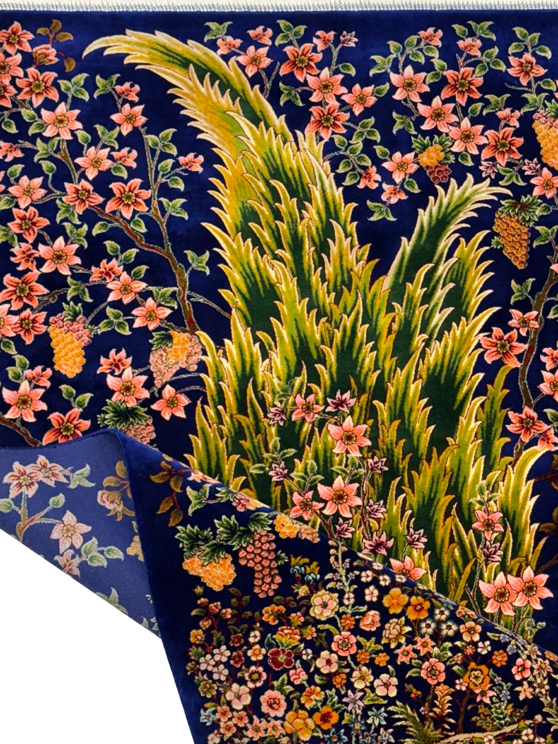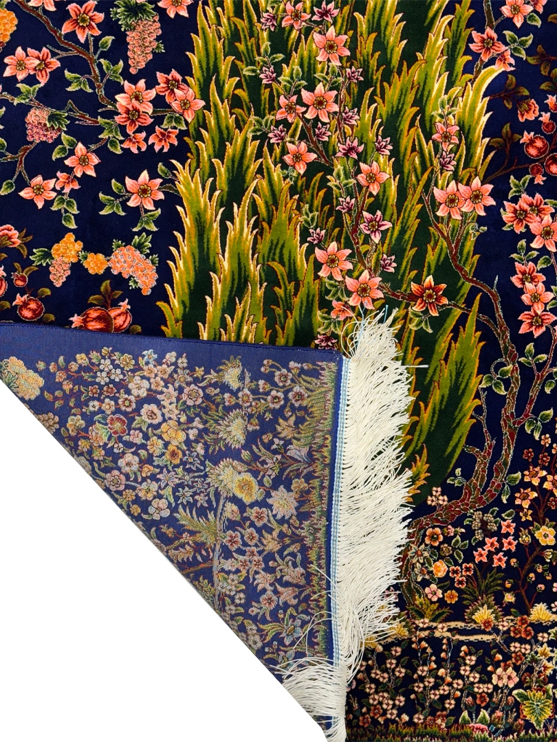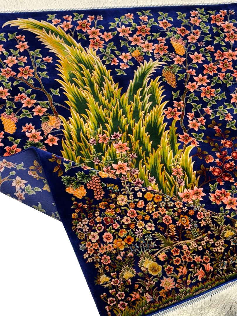 ربات بافت قم 80*120 مستطيل درخت سروي 70 رج ابريشم و بنبوسيلک سورمه‌اي سورمه‌اي 2 Kg