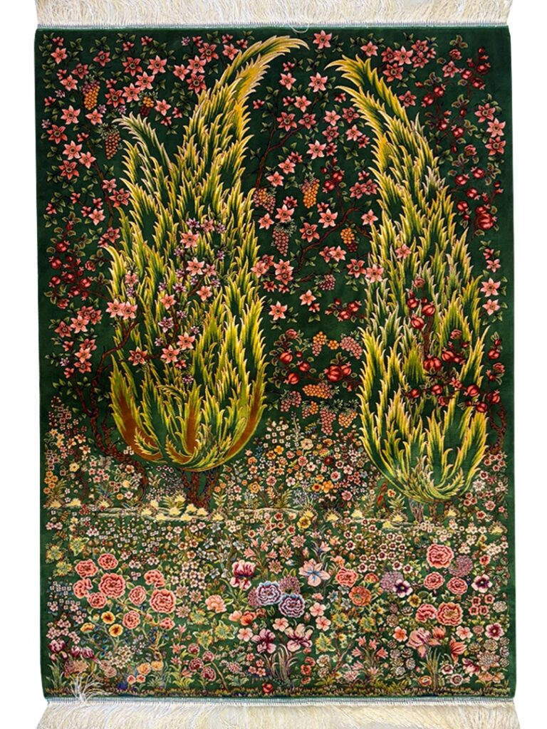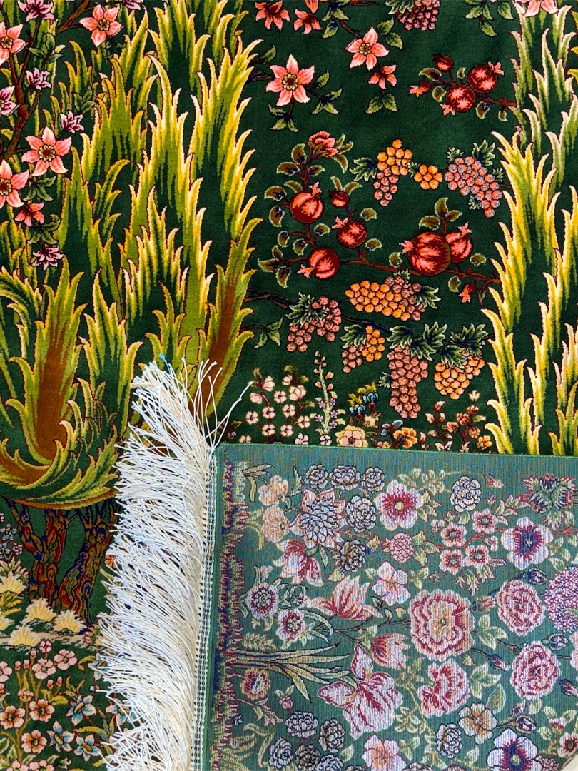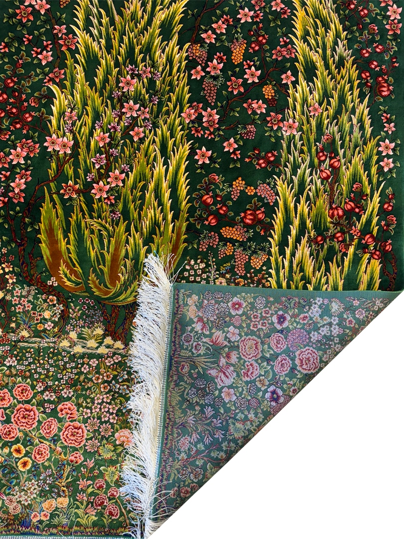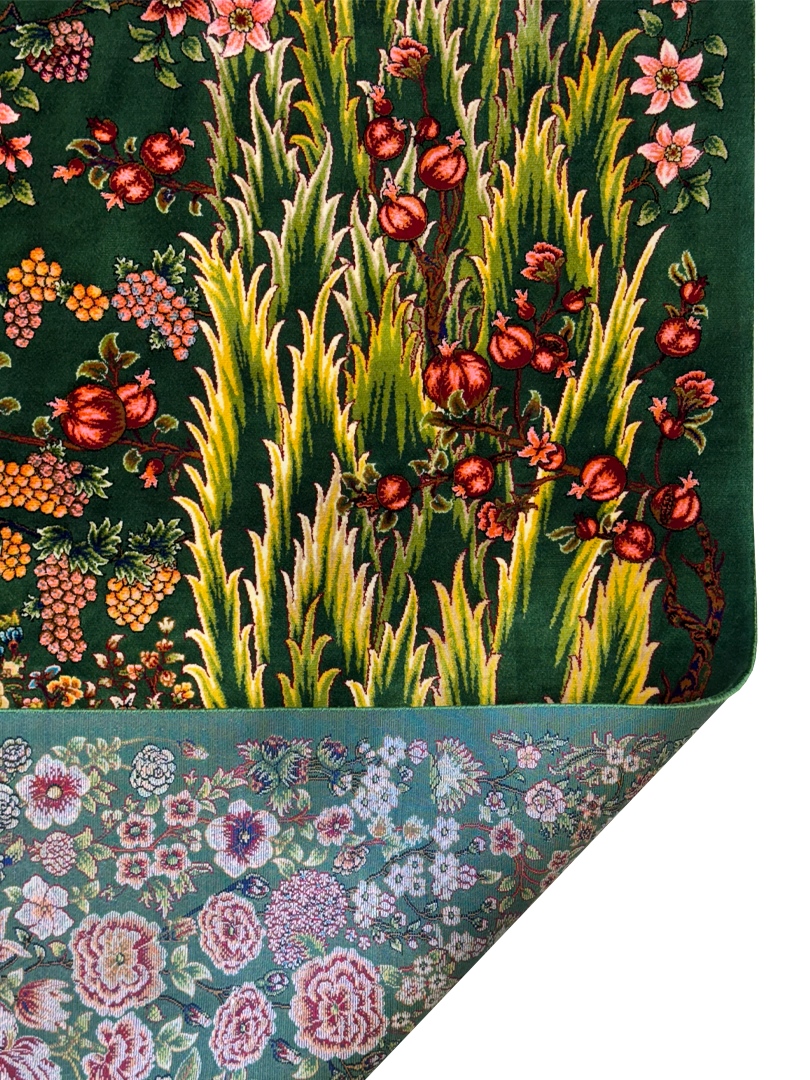 ربات بافت قم 100*150 مستطيل درخت سروي 70 رج ابريشم و بنبوسيلک سبز سبز 3 Kg