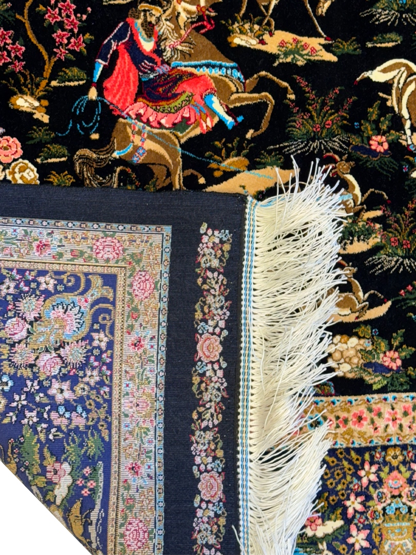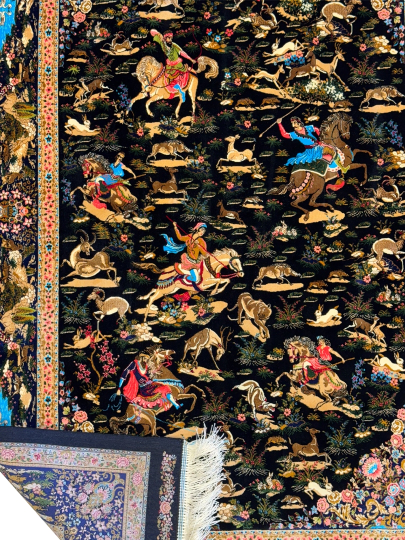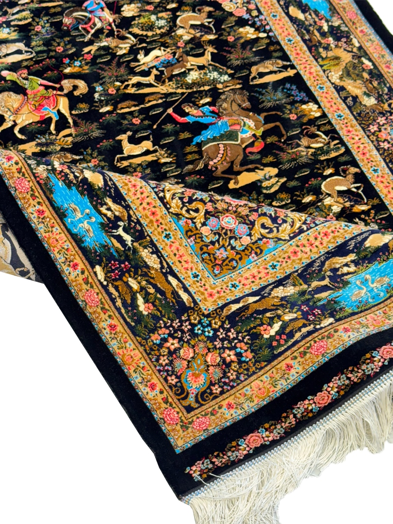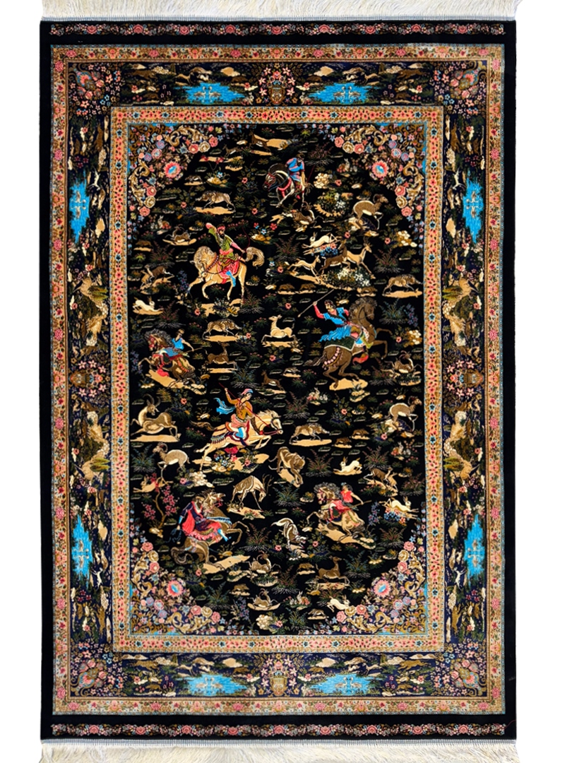 ربات بافت قم 100*150 مستطيل شکارگاه نجد 70 رج ابريشم و بنبوسيلک مشکي مشکي 2 Kg