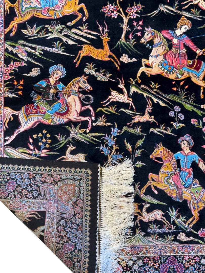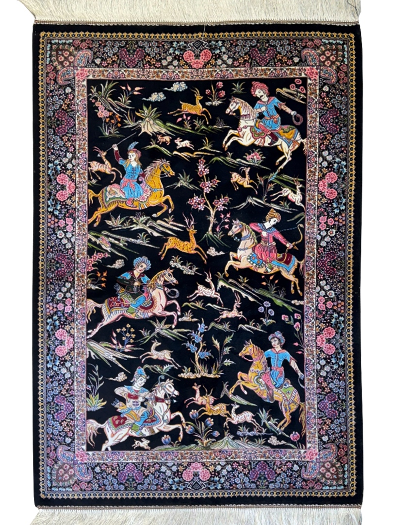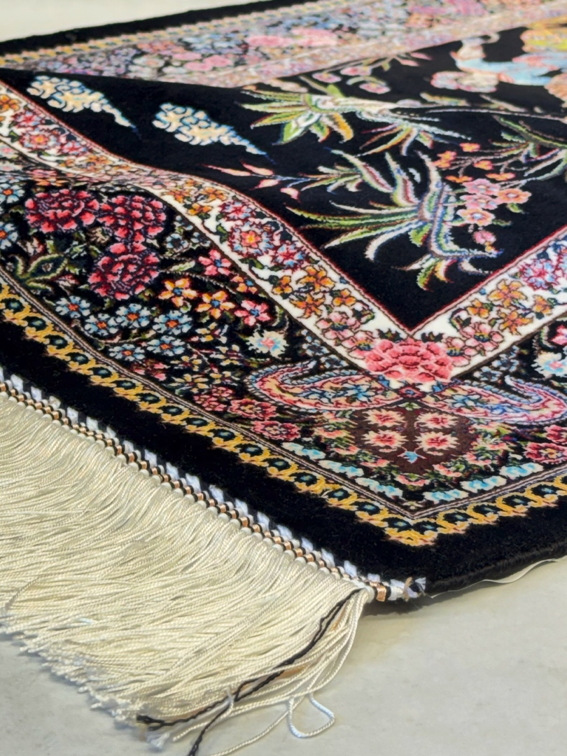 ربات بافت قم 80*120 مستطيل شکارگاه 70 رج ابريشم و بنبوسيلک مشکي مشکي 2 Kg