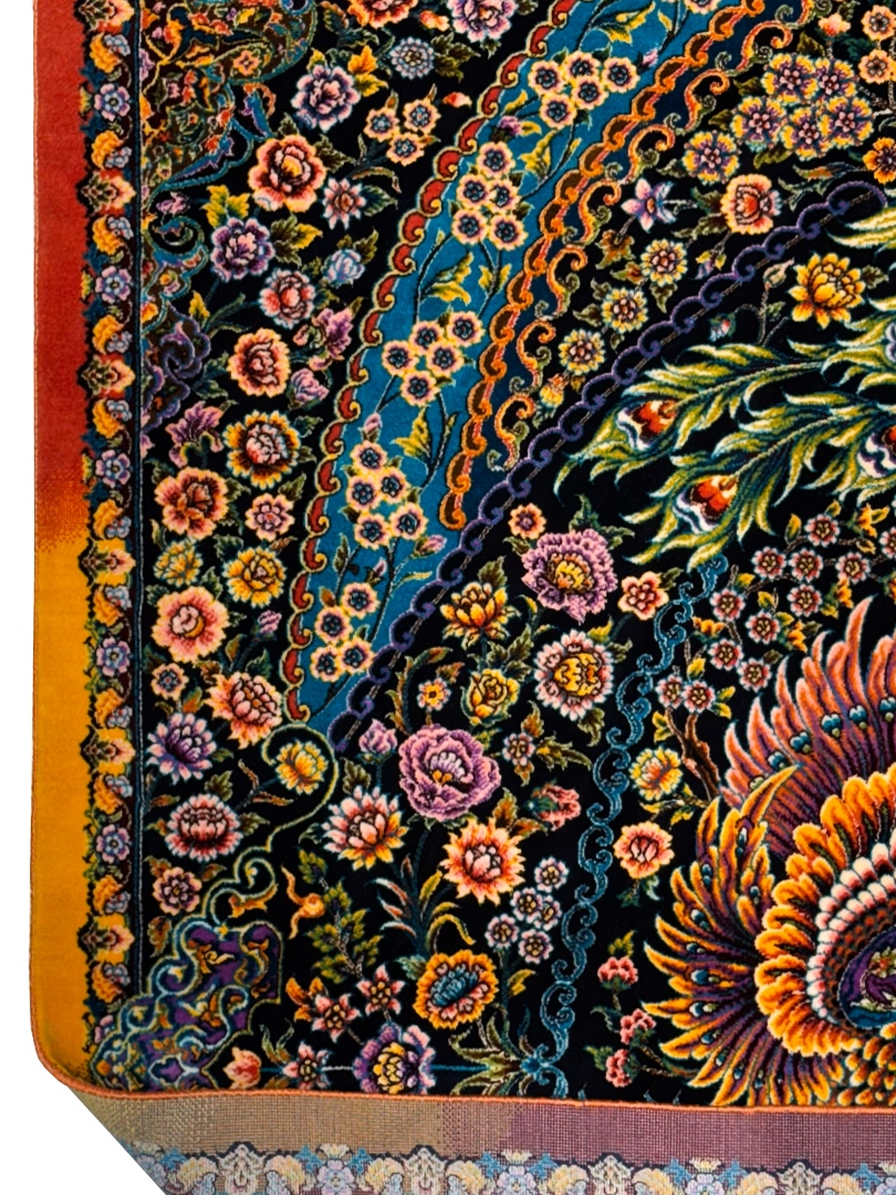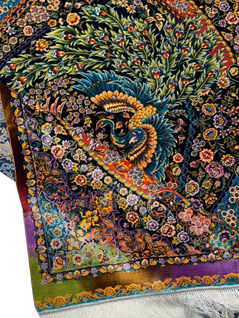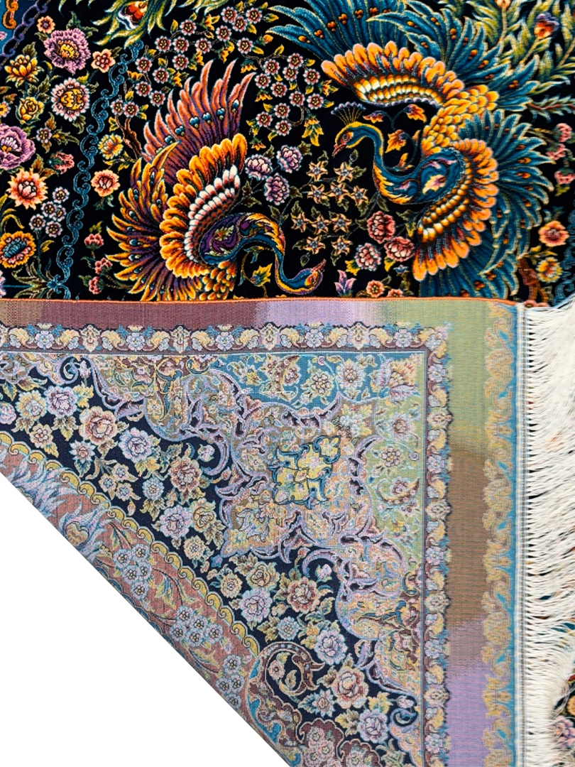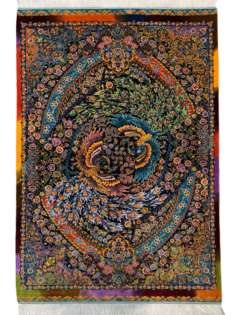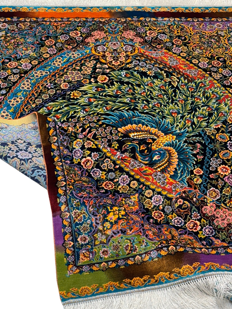 ربات بافت قم 100*150 مستطيل طاووسي بهرام 70 رج تمام ابريشم الوان الوان 2 Kg