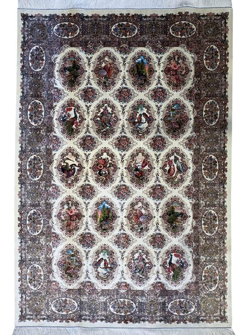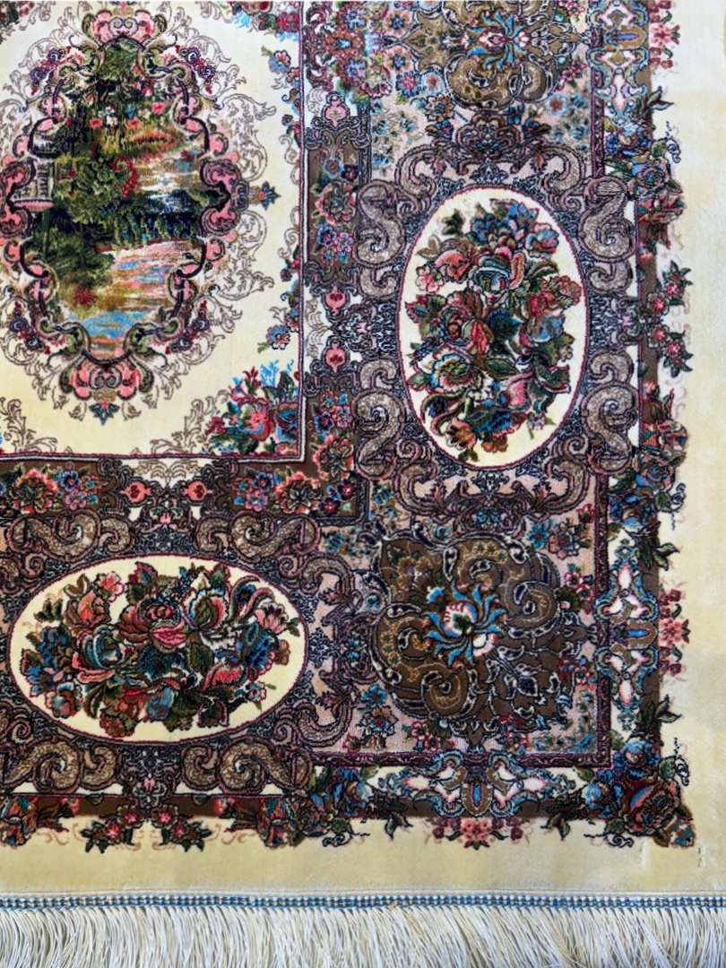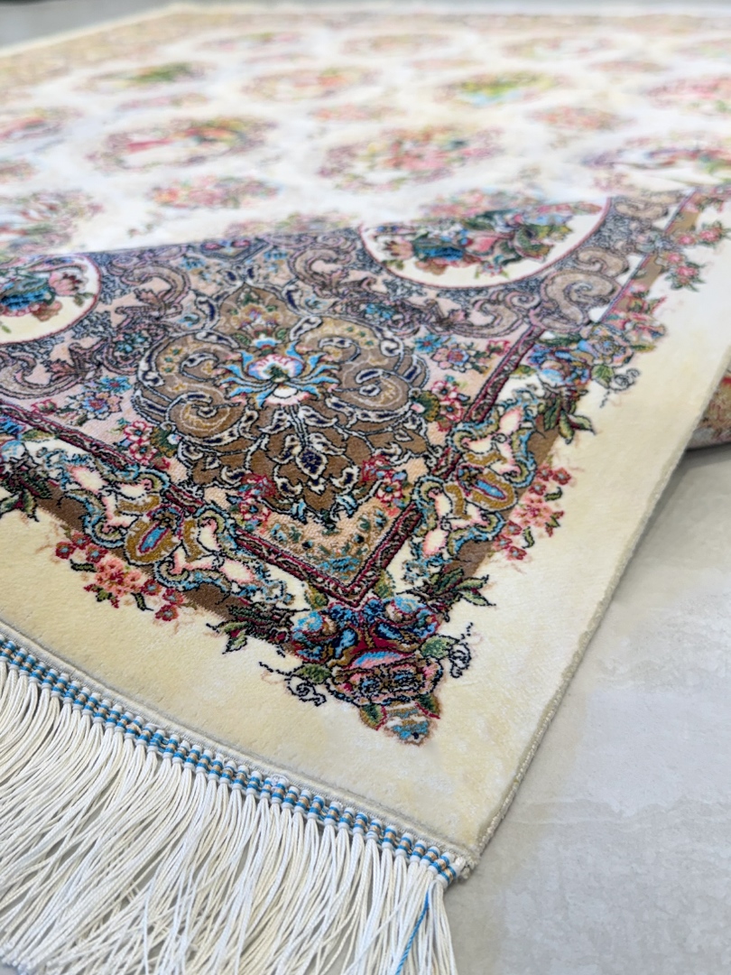 ربات بافت قم 150*225 مستطيل قابي گلستان 70 رج ابريشم و بنبوسيلک کرم کرم 7 Kg