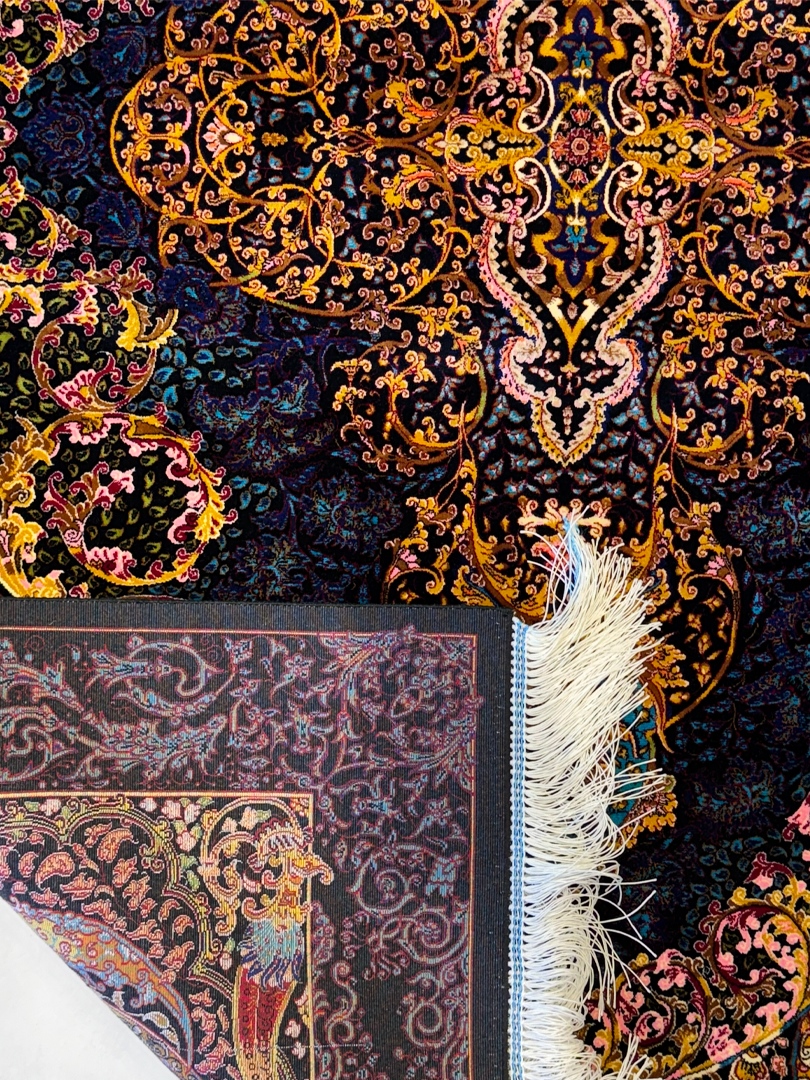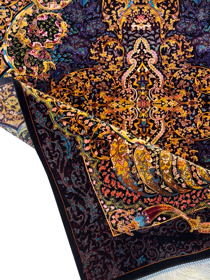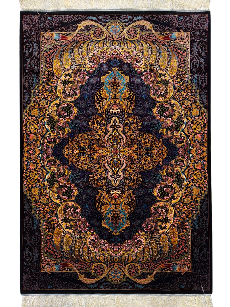 ربات بافت قم 100*150 مستطيل لچک ترنجي ارمي 70 رج ابريشم و بنبوسيلک مشکي الوان مشکي 3 Kg