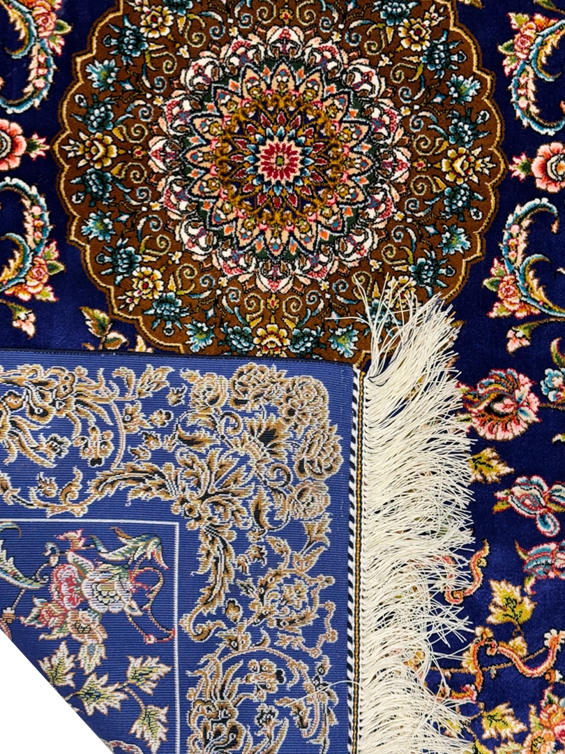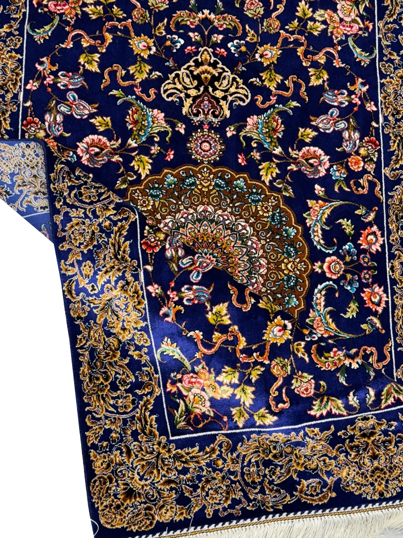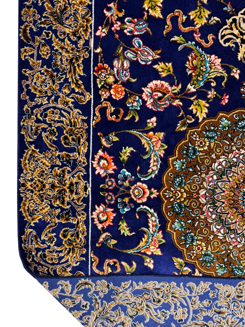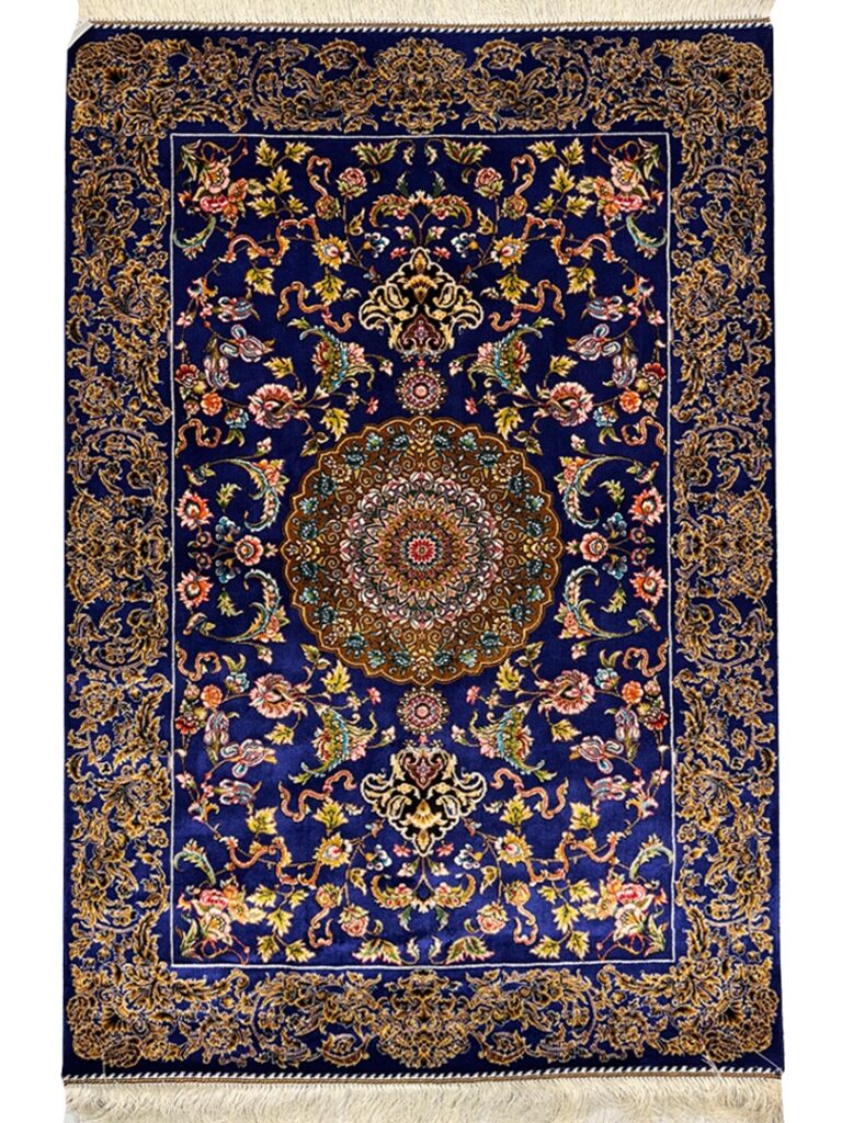 ربات بافت قم 80*120 مستطيل لچک ترنجي افشان 70 رج ابريشم و بنبوسيلک ابي سورمه ايي سورمه‌اي و طلايي kg1