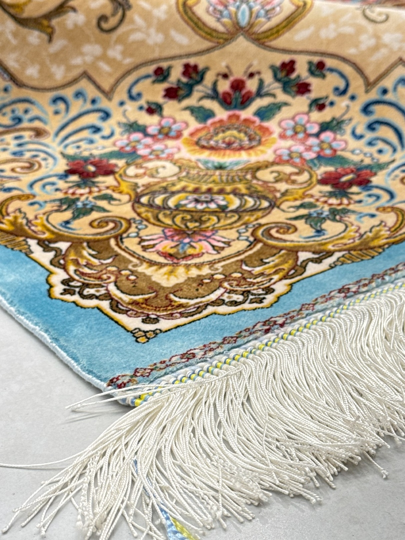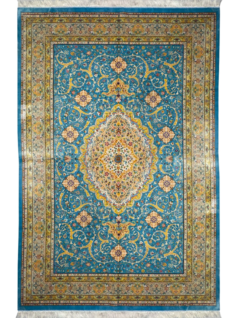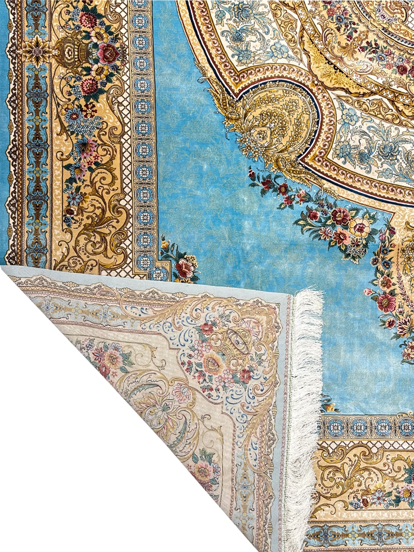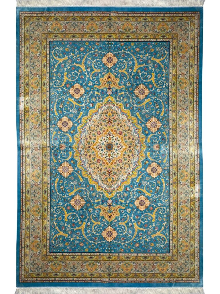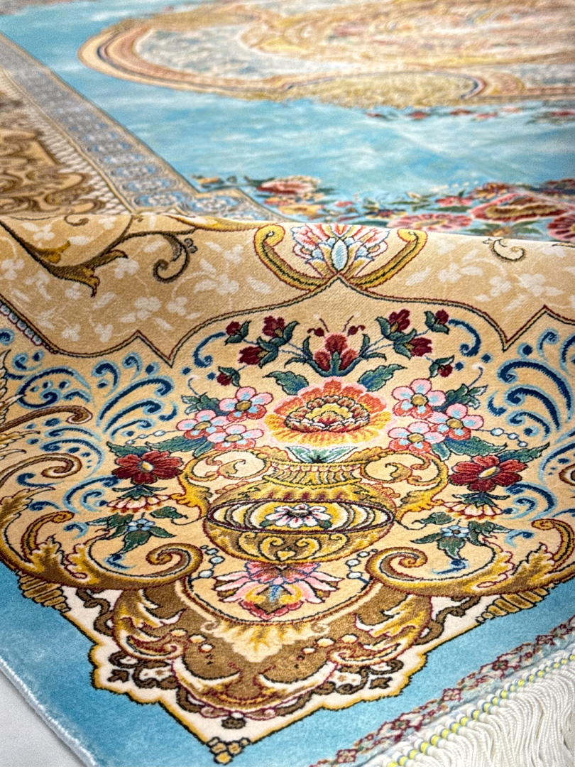 ربات بافت قم 200*300 مستطيل لچک ترنجي داسي 70 رج ابريشم و بنبوسيلک کرم فيروزه ايي فيروزه ايي و کرم 16 Kg