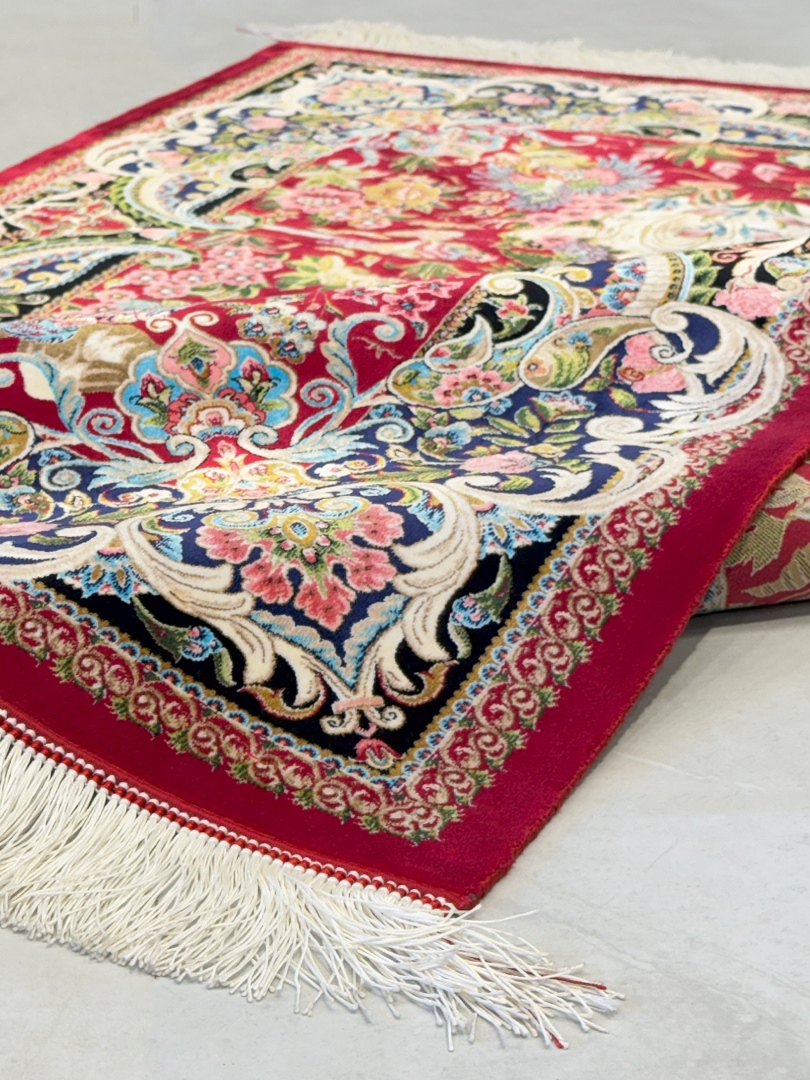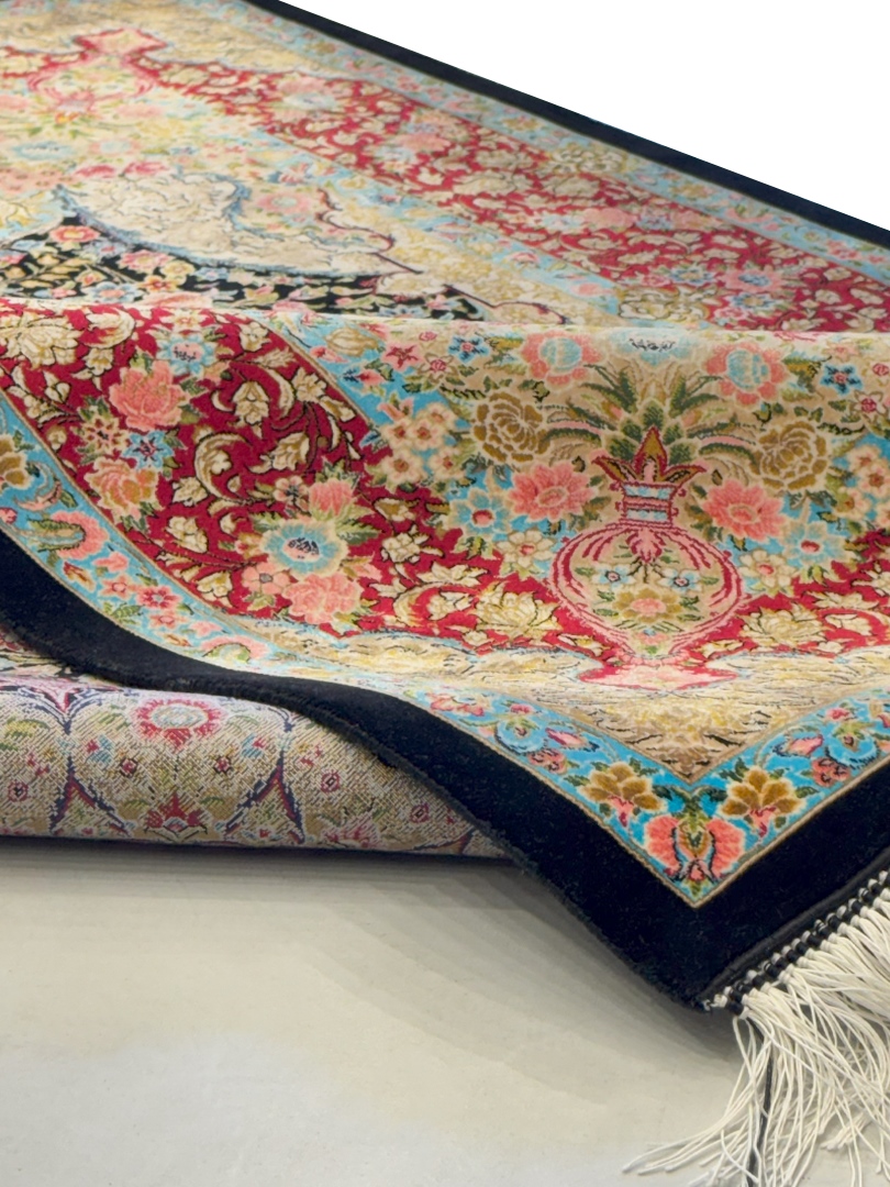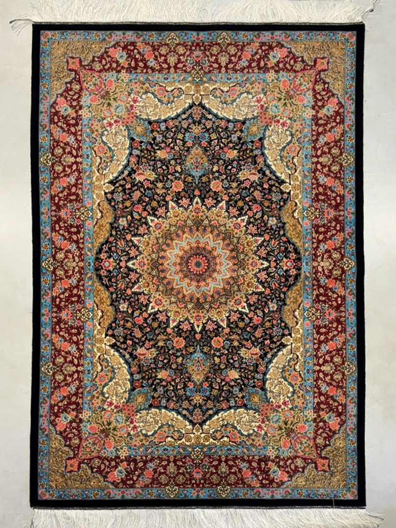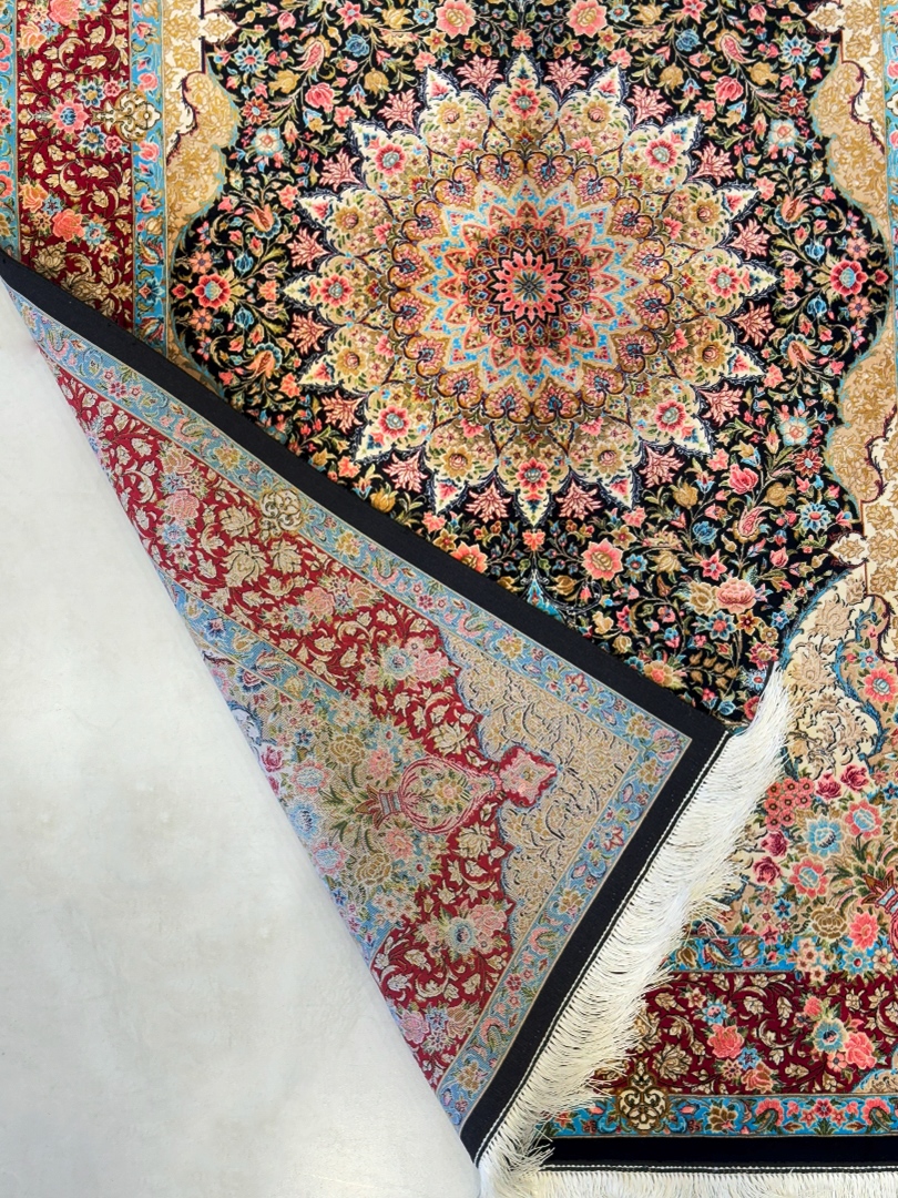 ربات بافت قم 100*150 مستطيل لچک ترنجي معصومي 70 رج ابريشم و بنبوسيلک مشکي مشکي 3 Kg