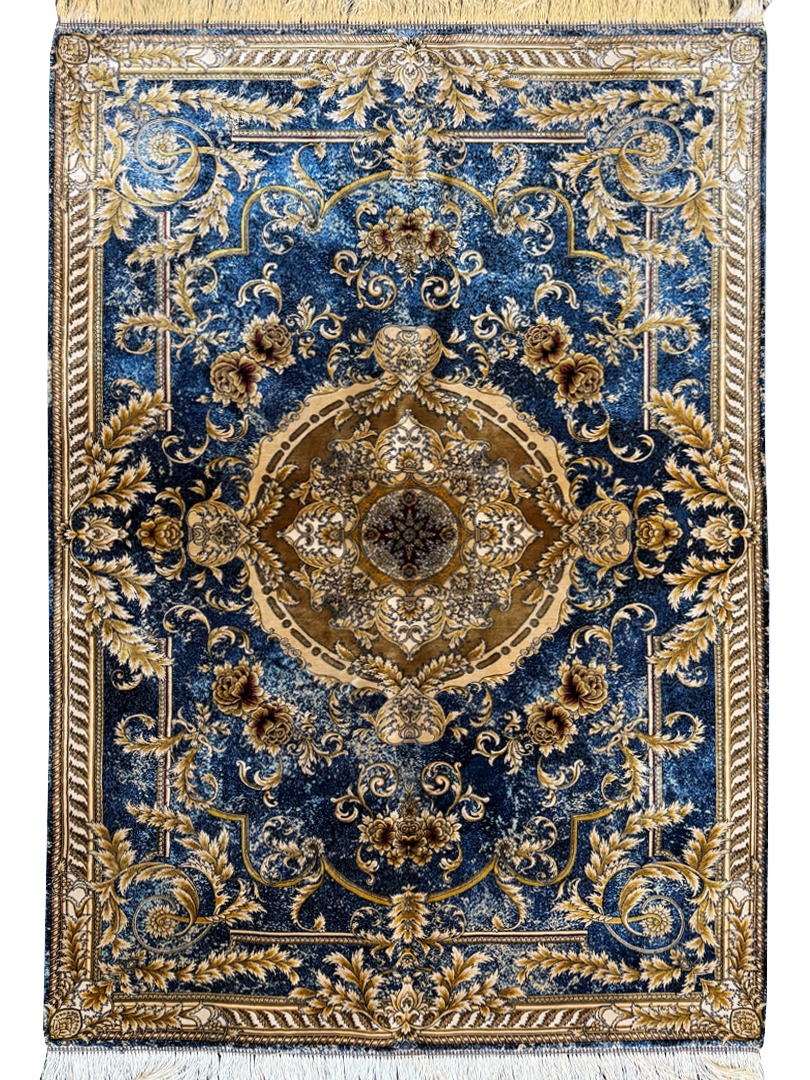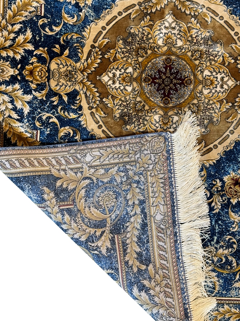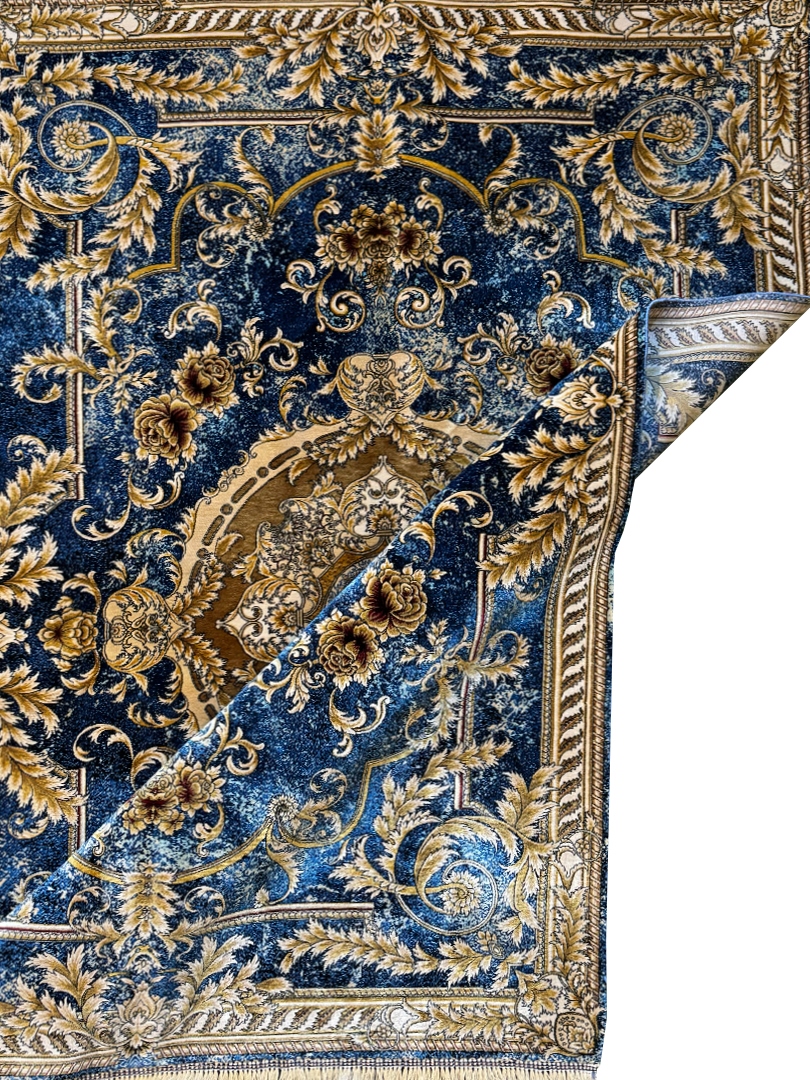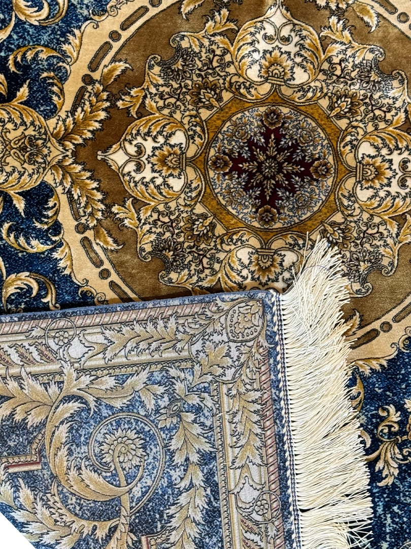 ربات بافت قم 100*150 مستطيل لچک ترنجي گلابتون 70 رج ابريشم و بنبوسيلک ابي کرم کرم ابي 2 Kg