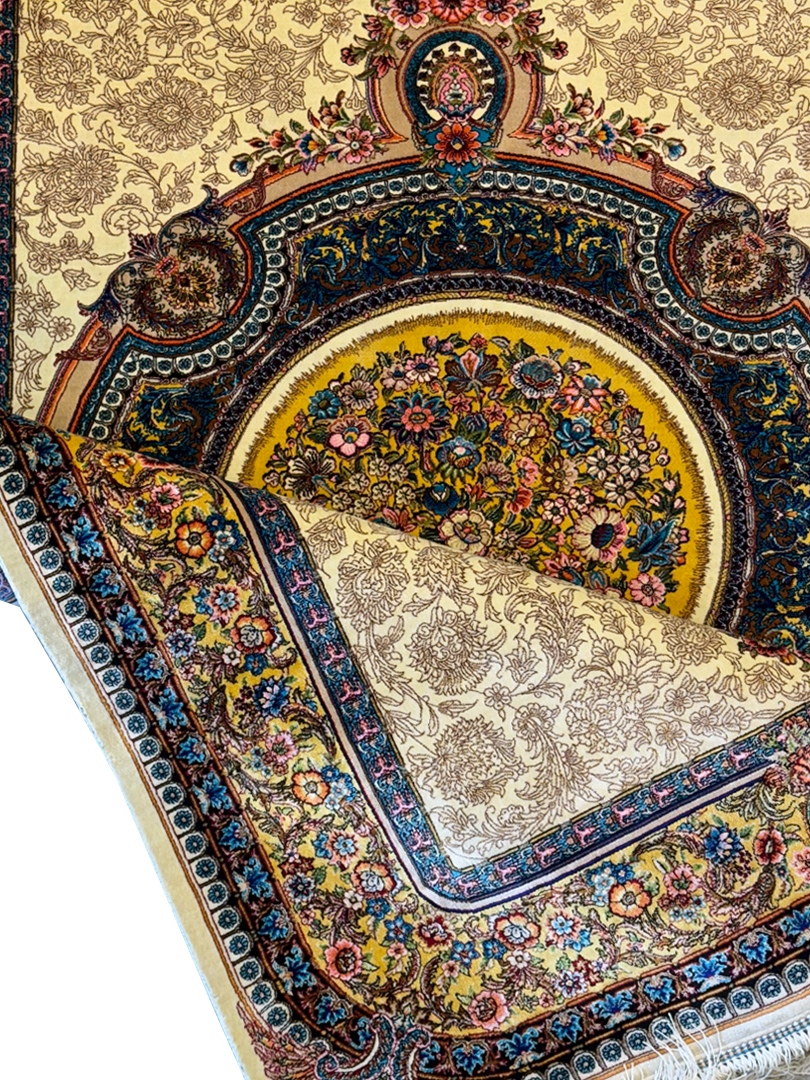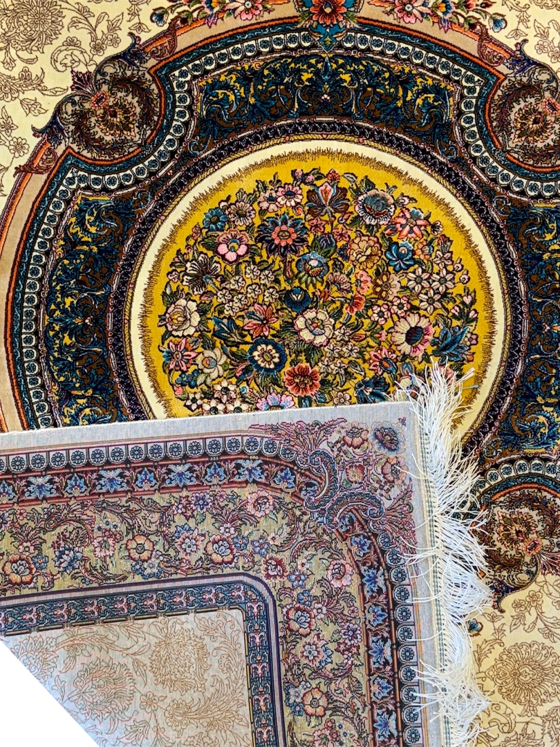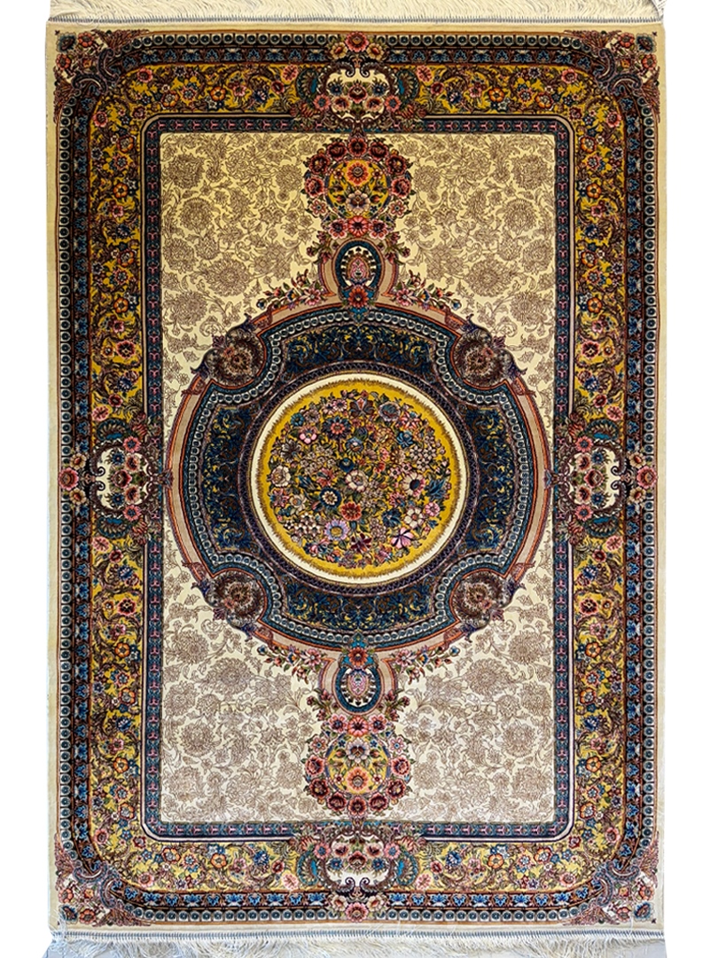 ربات بافت قم 100*150 مستطيل لچک ترنجي گلابتون 70 رج ابريشم و بنبوسيلک کرم کرم 3 Kg