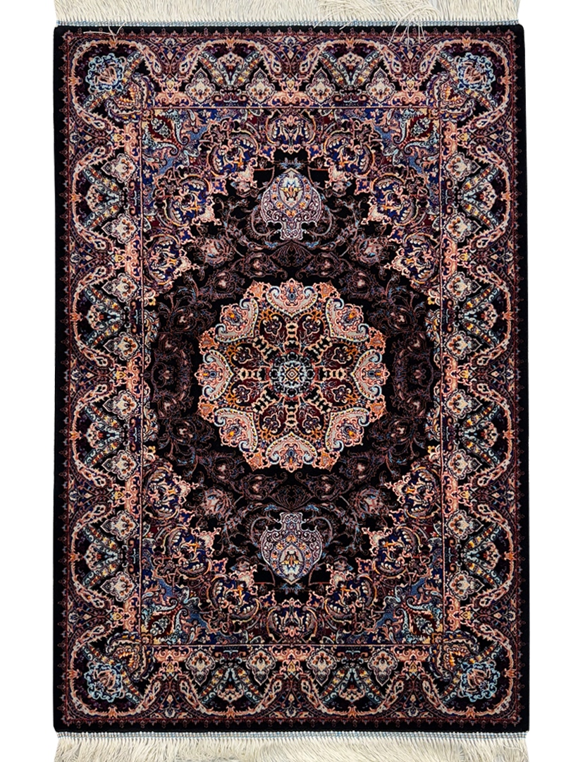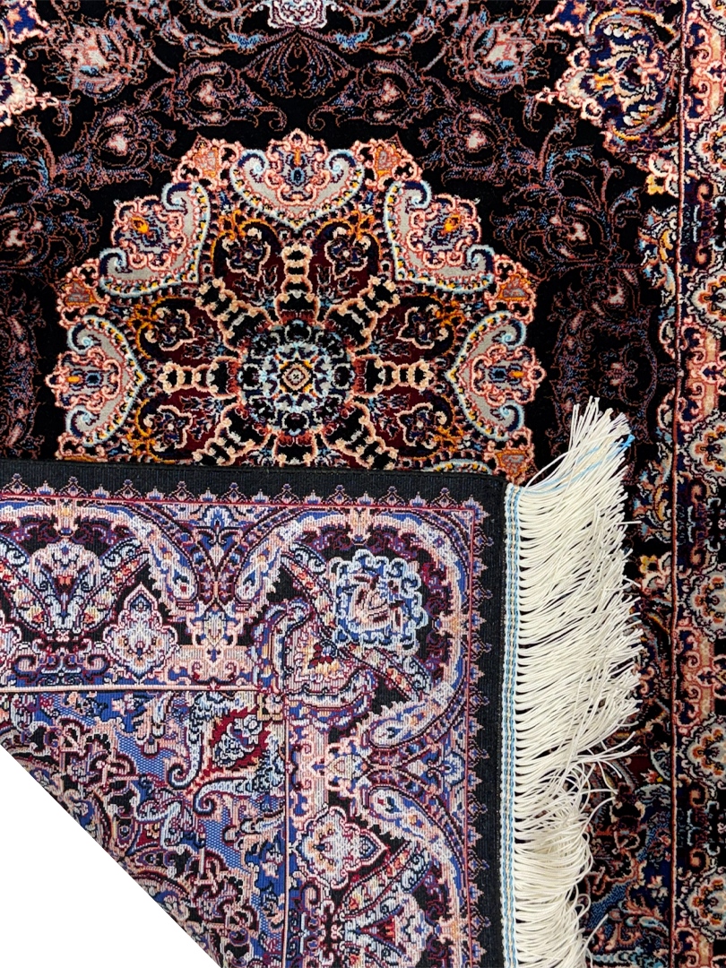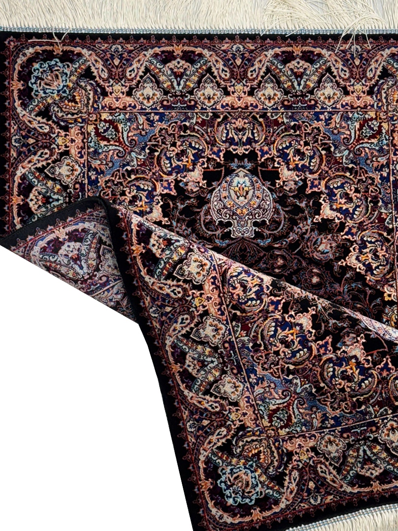 ربات بافت قم 60*90 مستطيل لچک ترنج باغ طاووس 70 رج ابريشم و بنبوسيلک طوسي شرابي kg1