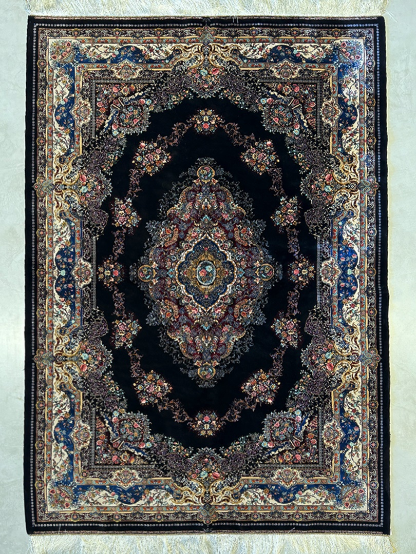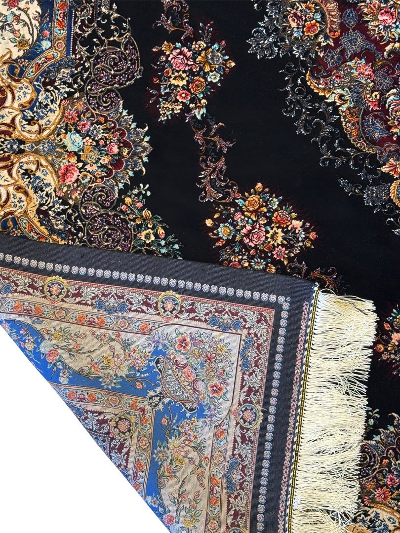 ربات بافت قم 150*225 مستطيل لچک ترنجي 70 رج ابريشم و بنبوسيلک مشکي مشکي 8 Kg