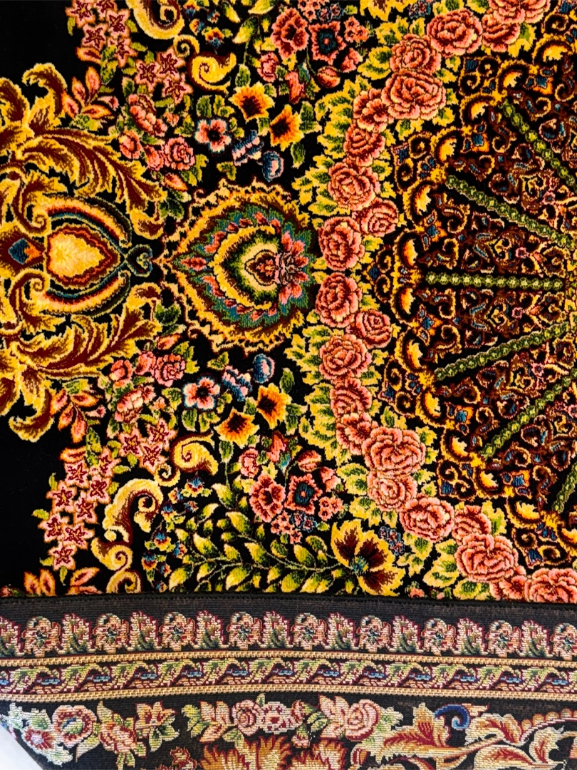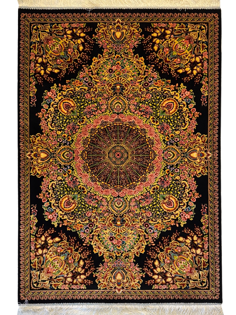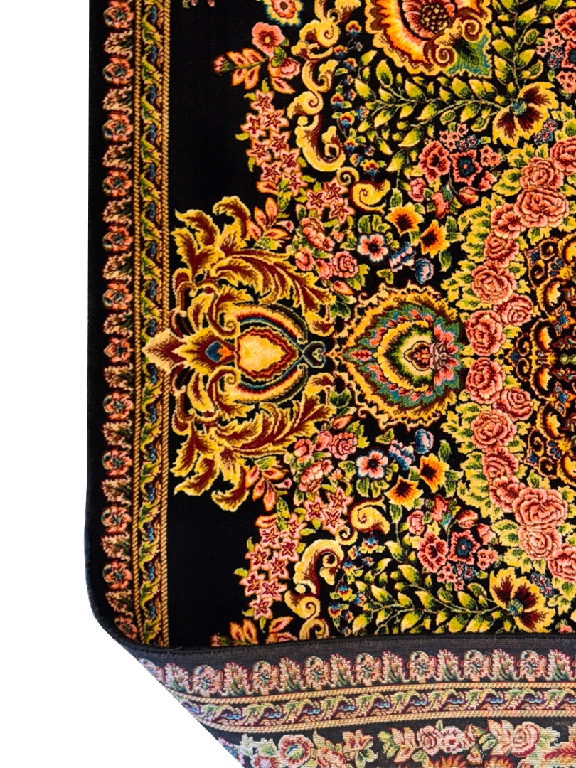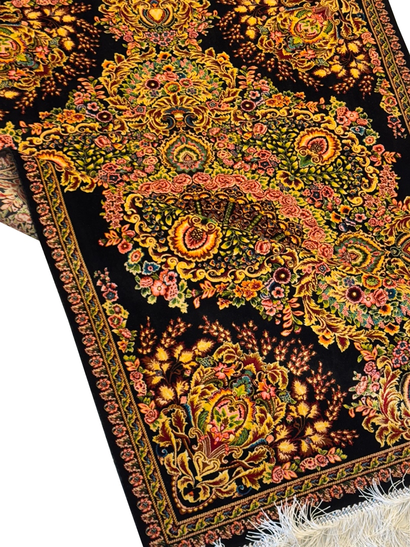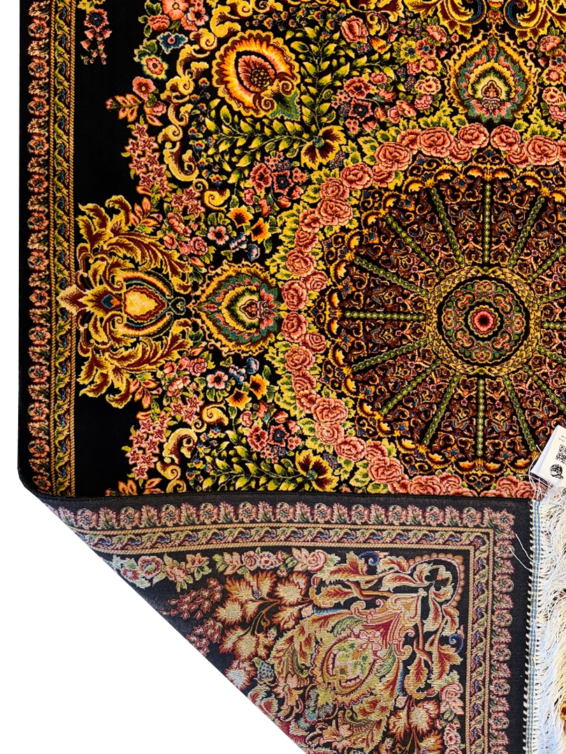 ربات بافت قم 100*150 مستطيل لچک ترنجي 70 رج ابريشم و بنبوسيلک مشکي مشکي 3 Kg