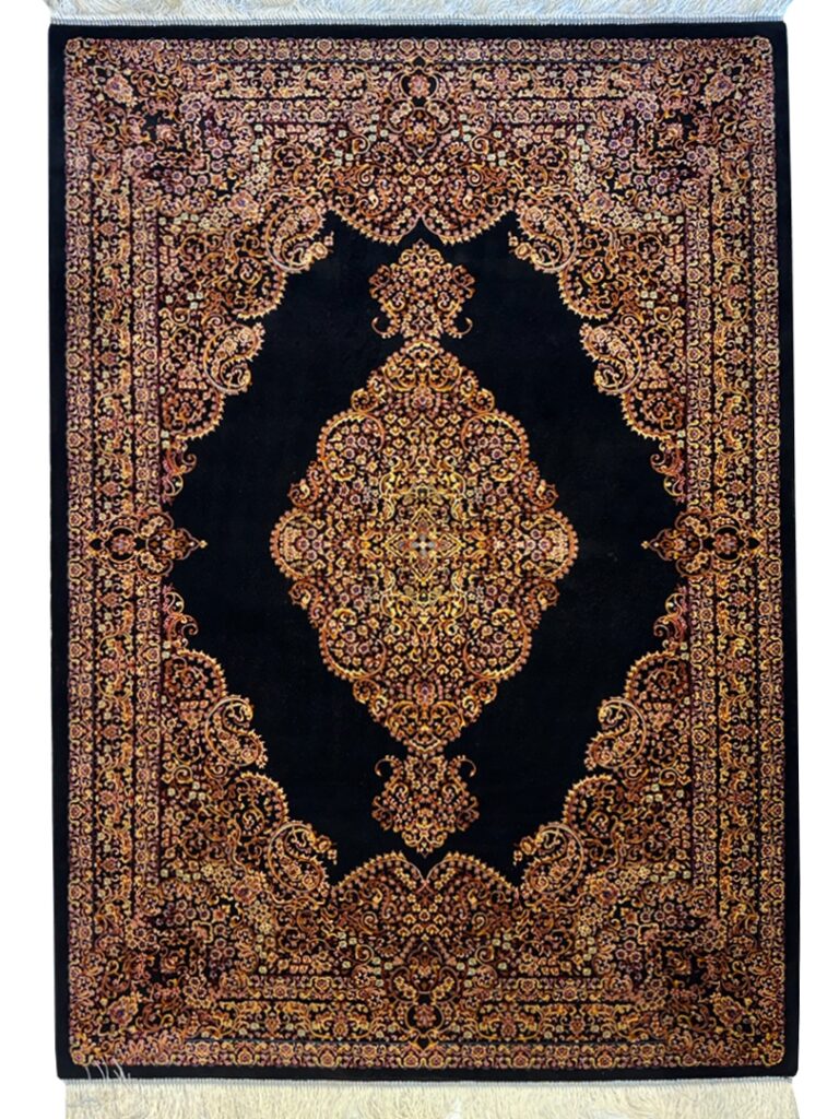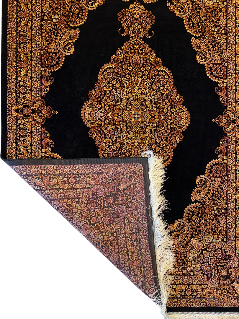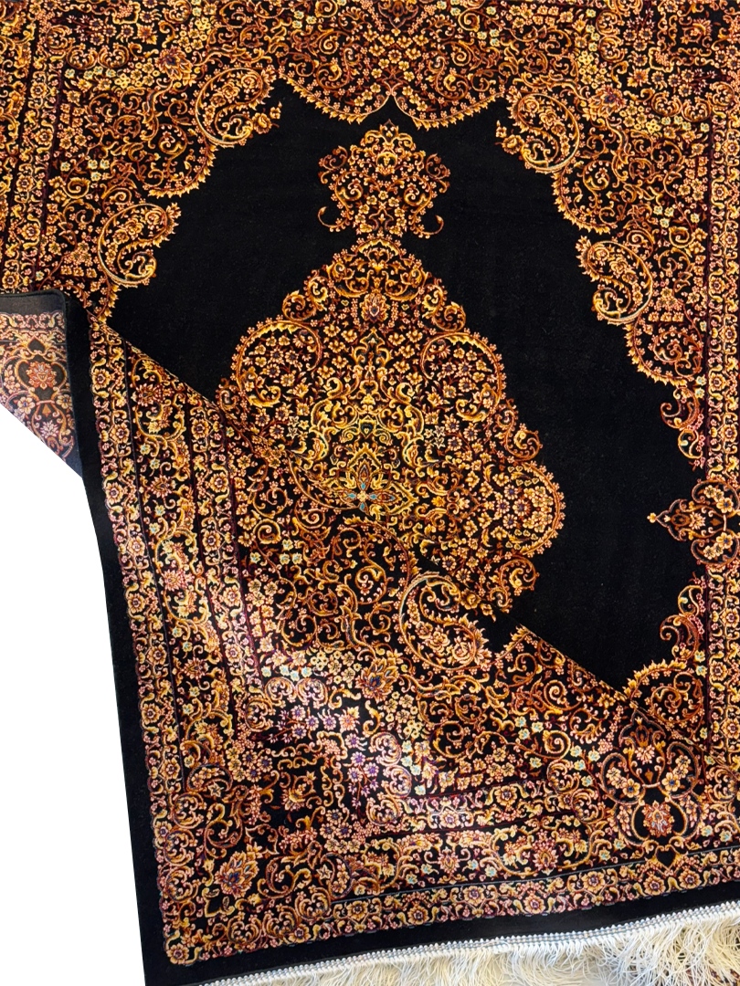 ربات بافت قم 100*150 مستطيل لچک ترنجي 70 رج ابريشم و بنبوسيلک مشکي طلايي مشکي طلايي 3 Kg