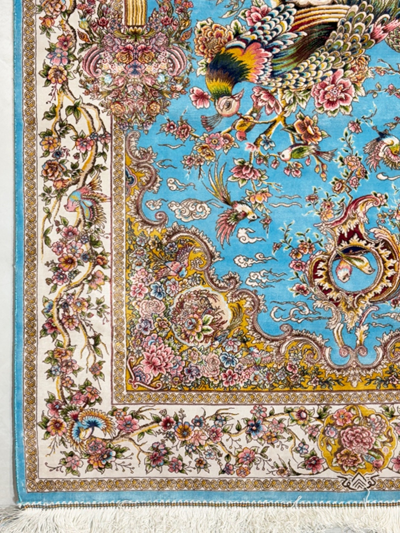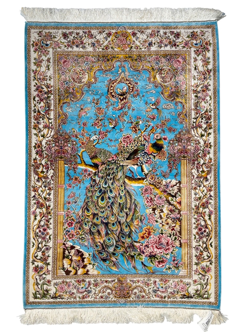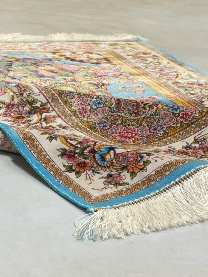 ربات بافت قم 100*150 مستطيل لچک ترنج باغ طاووس 70 رج ابريشم و بنبوسيلک ابي اسماني کرم 3 Kg
