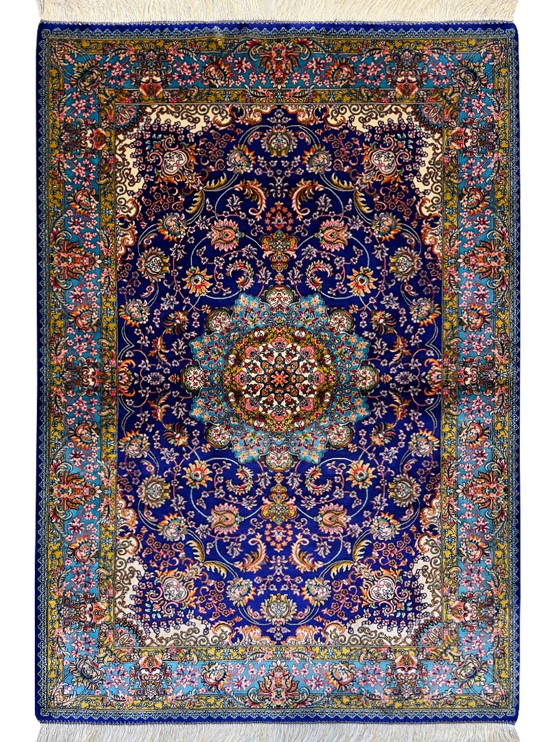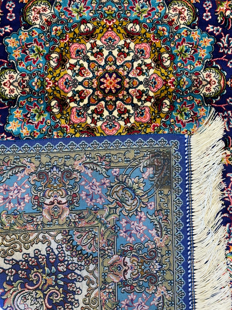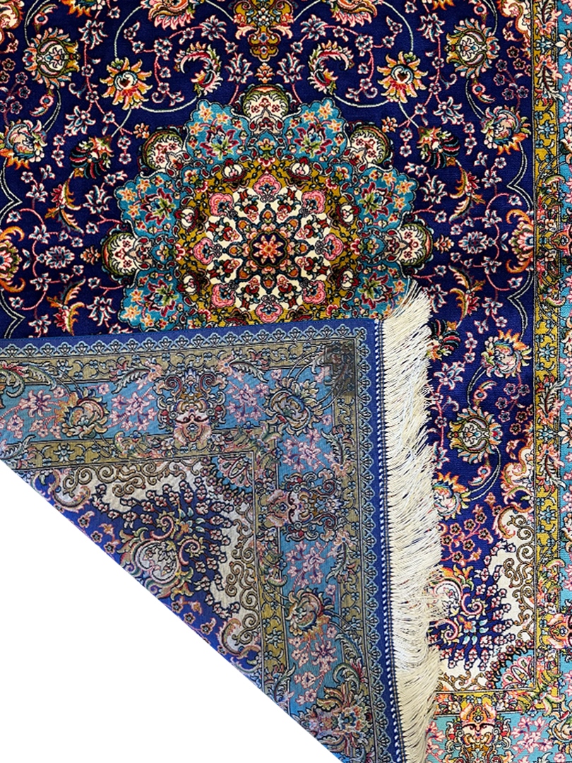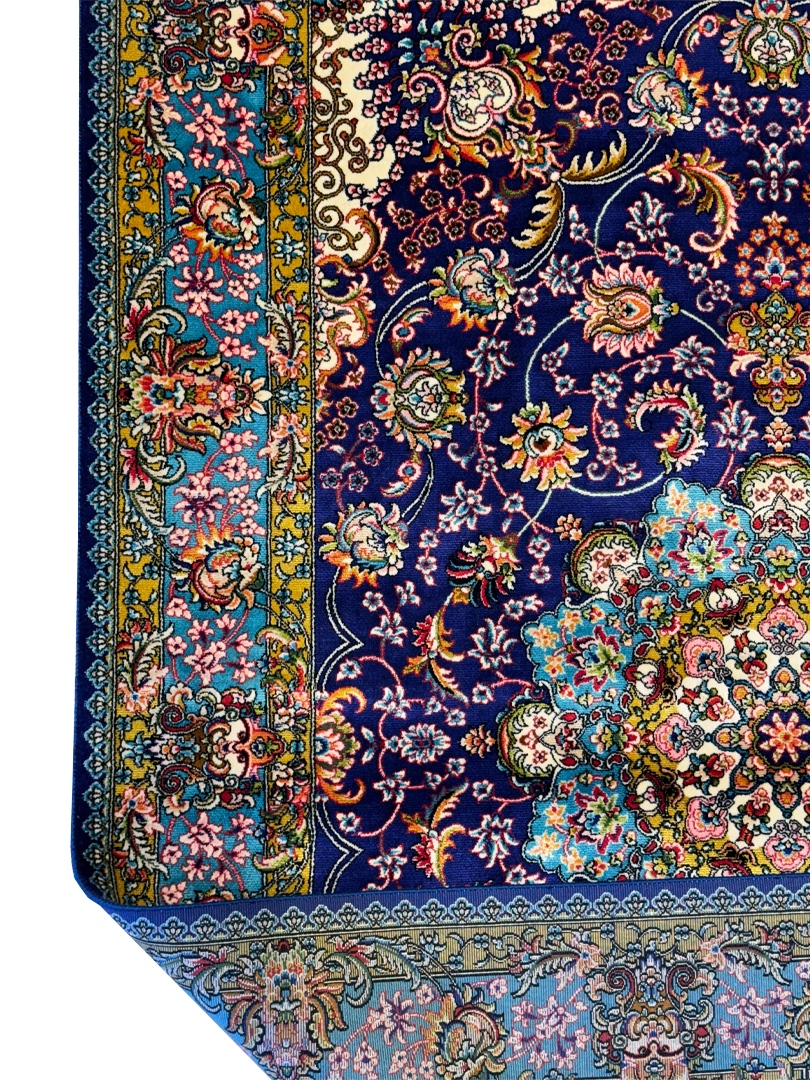 ربات بافت قم 100*150 مستطيل لچک ترنچي پيچک 70 رج ابريشم و بنبوسيلک لاجوردي ابي سورمه ايي 3 Kg