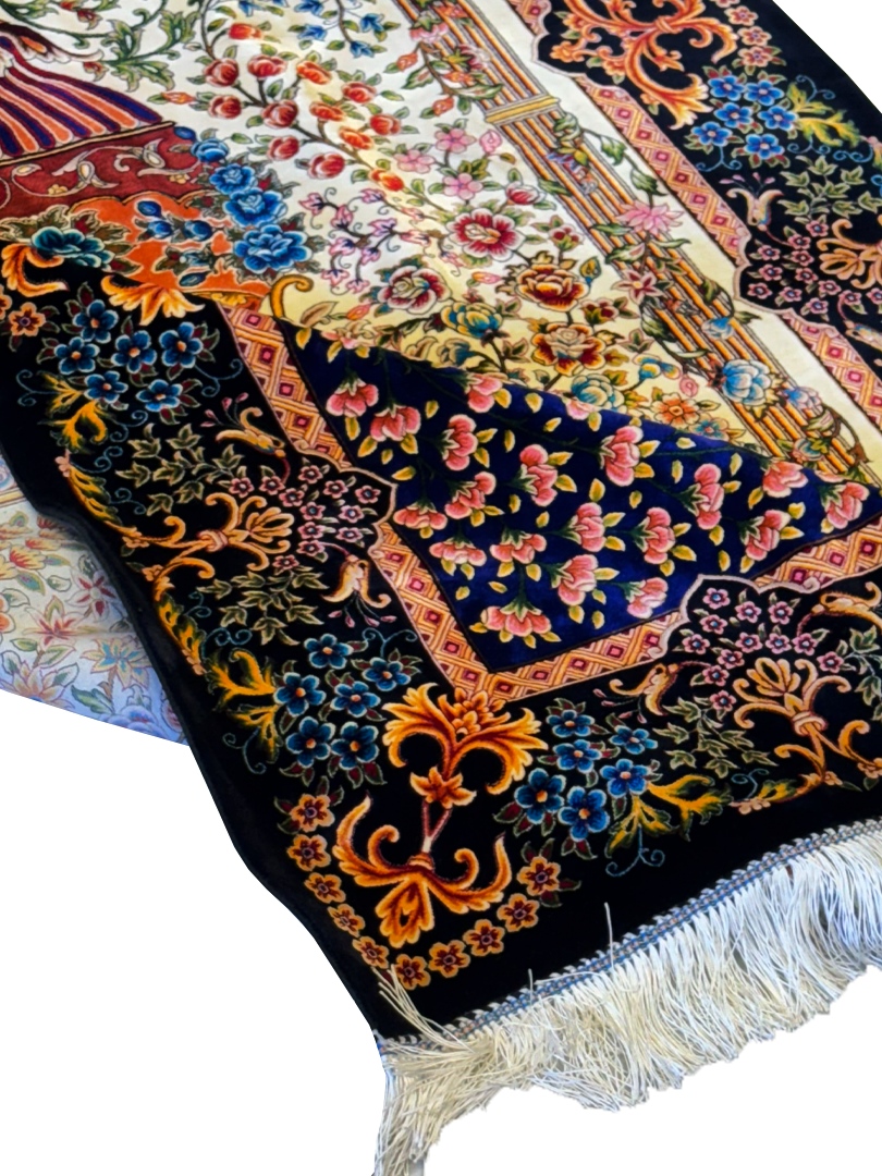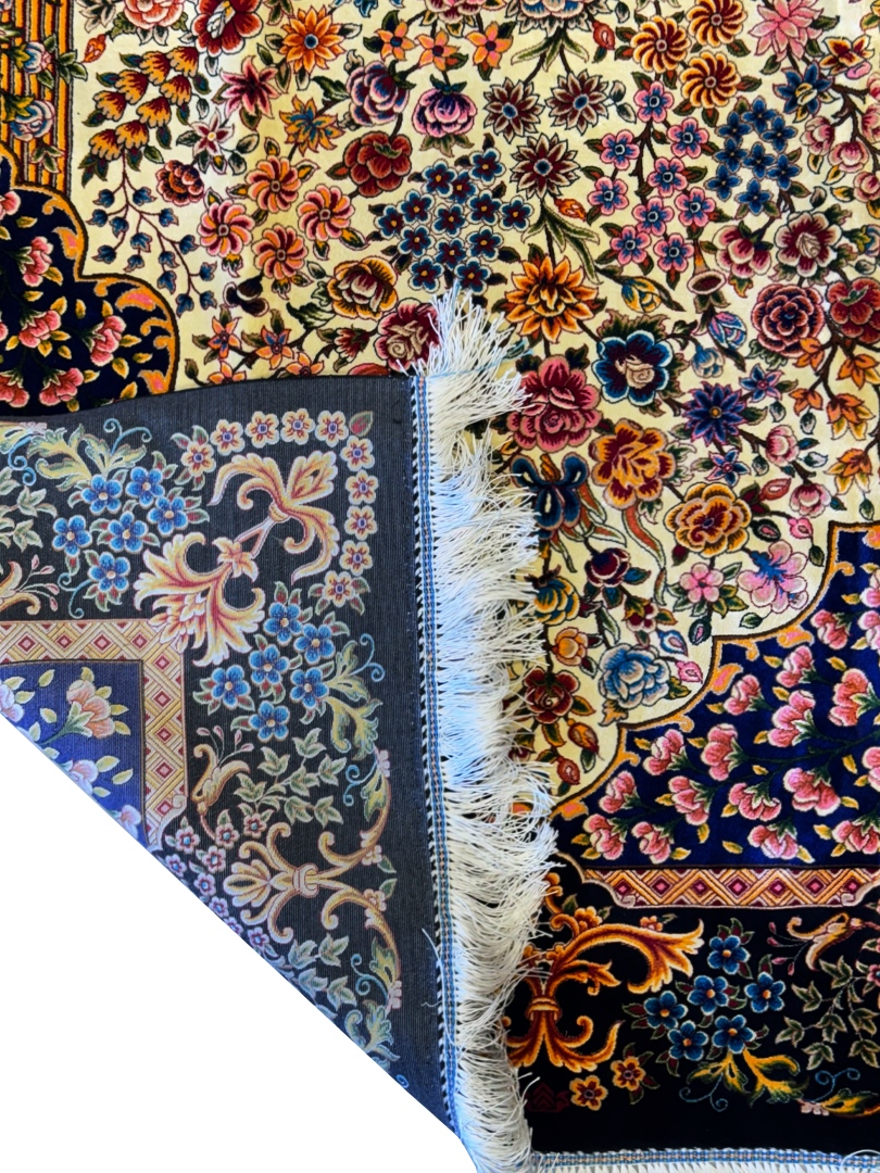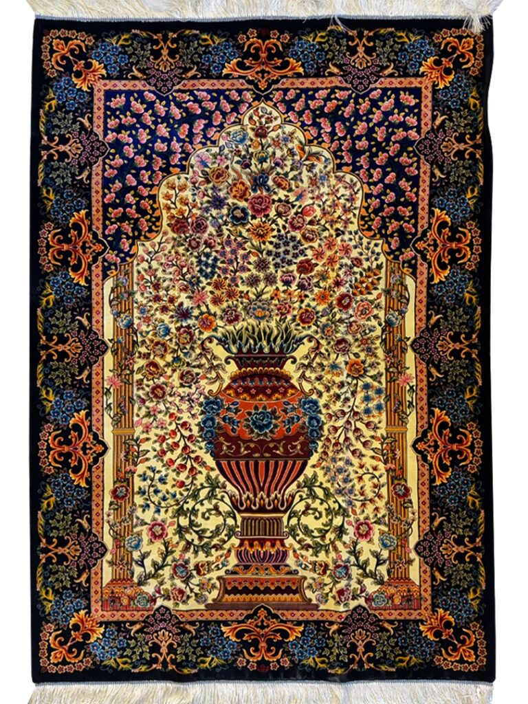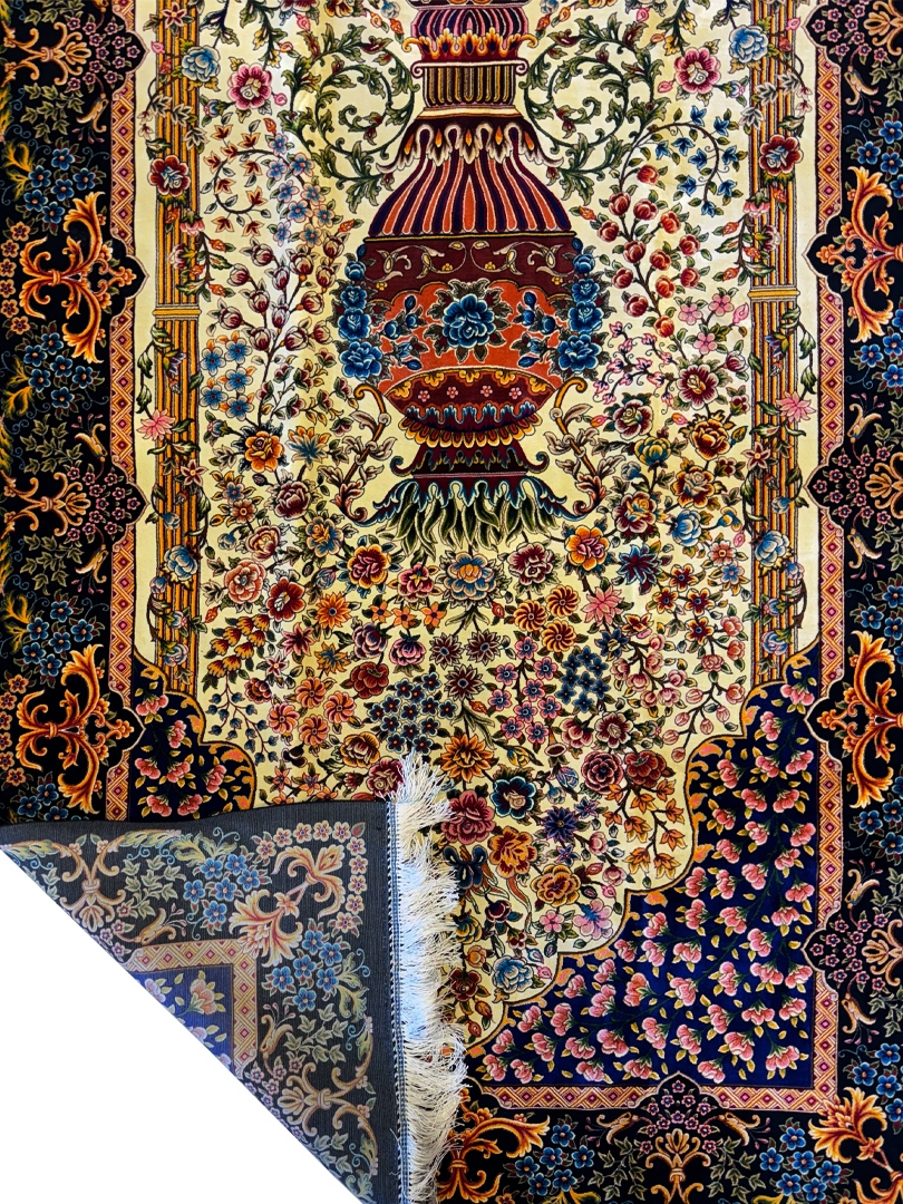 ربات بافت قم 120*180 مستطيل محرابي گلداني 70 رج ابريشم و بنبوسيلک کرم و بژ مشکي 5 Kg