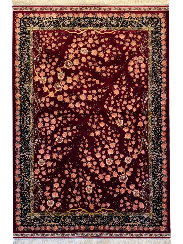 ربات بافت قم 100*150 مستطيل هزار گل 70 رج ابريشم و بنبوسيلک شرابي شرابي 3 Kg