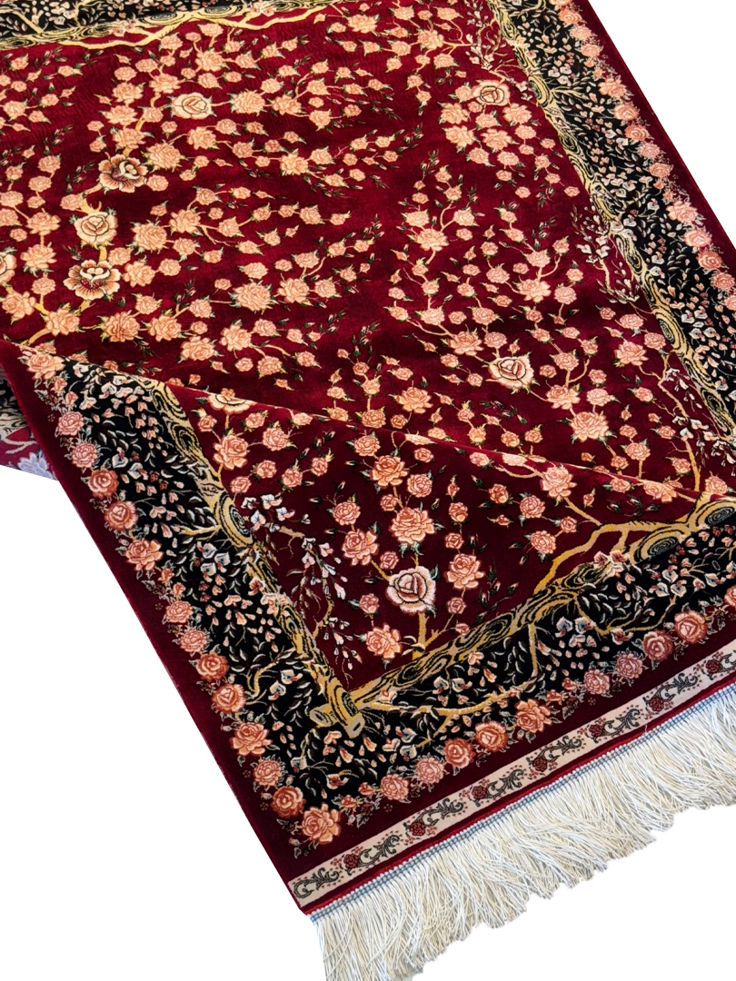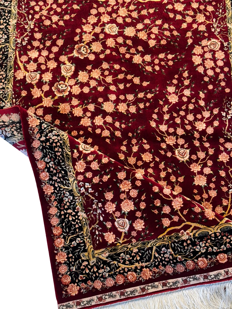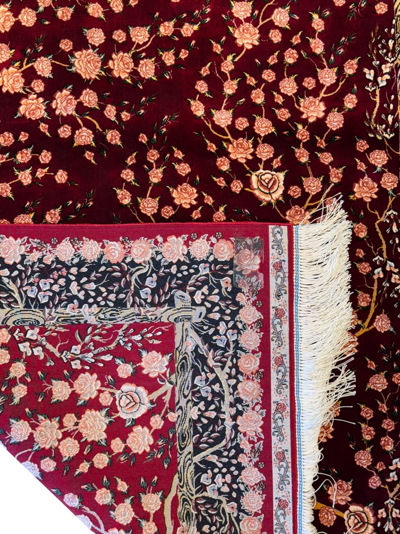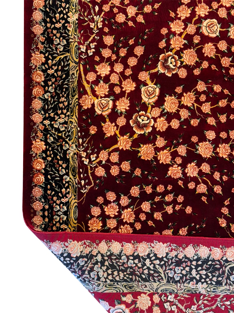ربات بافت قم 100*150 مستطيل هزار گل 70 رج ابريشم و بنبوسيلک شرابي شرابي 3 Kg
