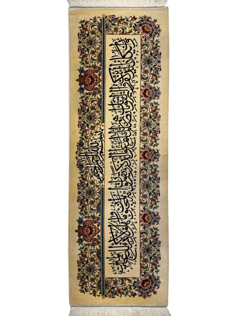 ربات بافت قم 150*50 مستطيل وان يکاد 70 رج ابريشم و بنبوسيلک کرم مشکي الوان kg1