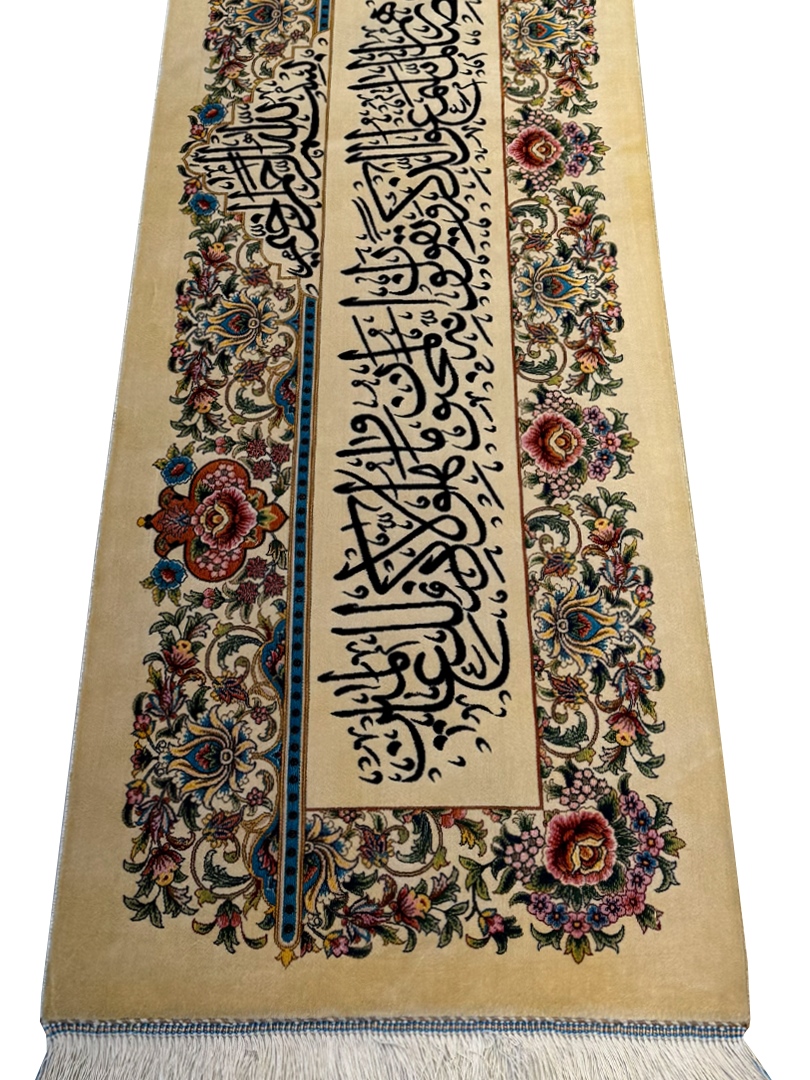 ربات بافت قم 150*50 مستطيل وان يکاد 70 رج ابريشم و بنبوسيلک کرم مشکي الوان kg1