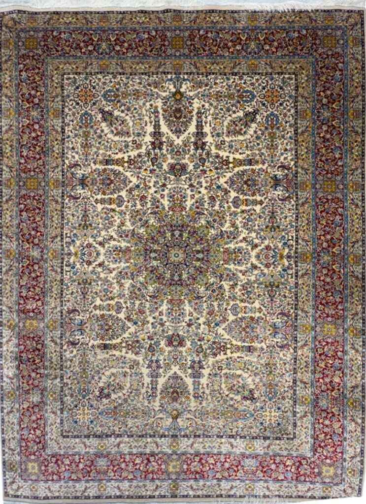 ربات بافت تبريز 250*350 مستطيل چلسي 50 رج کرک ابريشم با حاشيه ابريشم کرم الوان شرابي الوان 15 Kg
