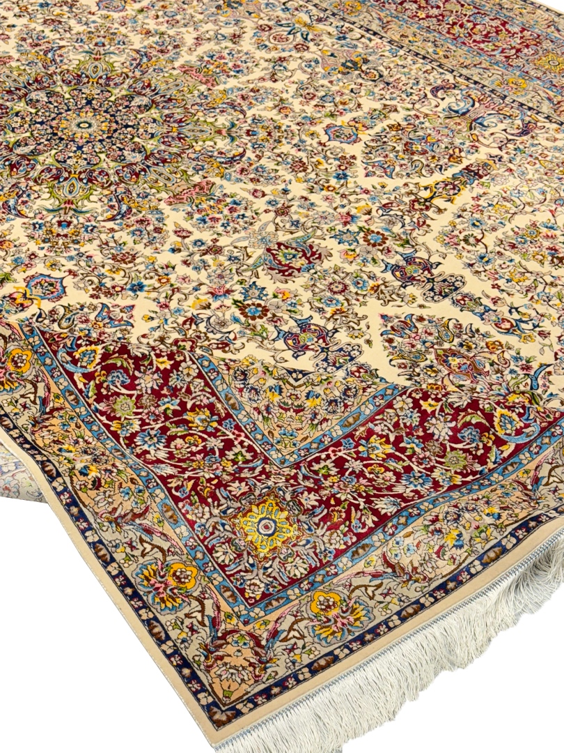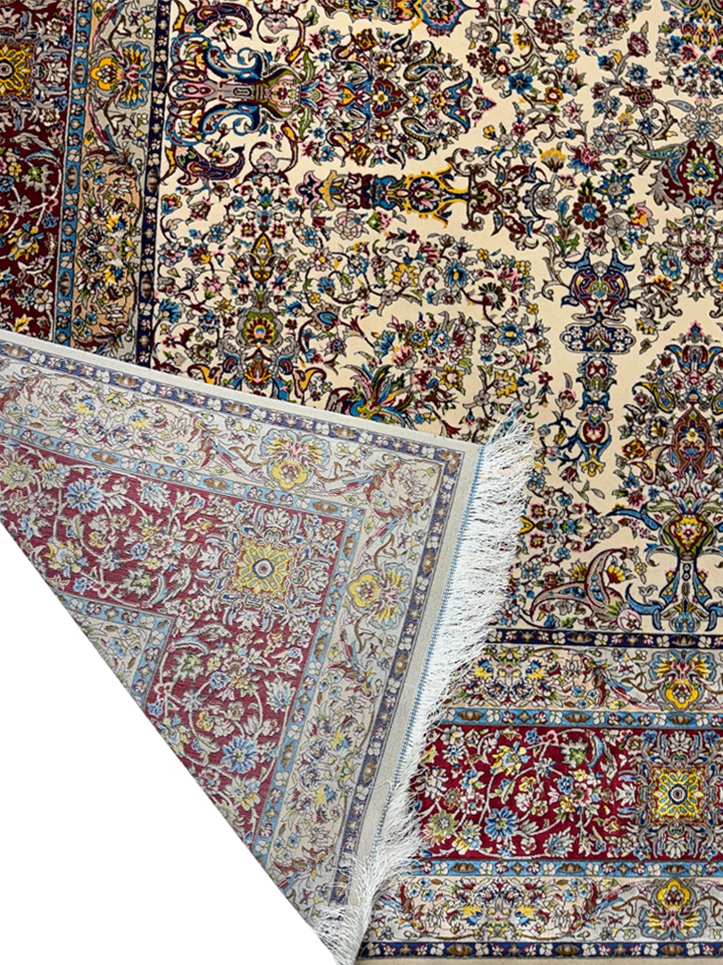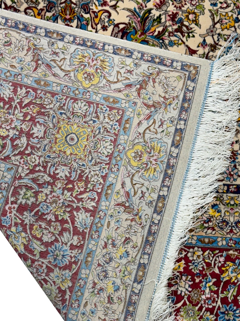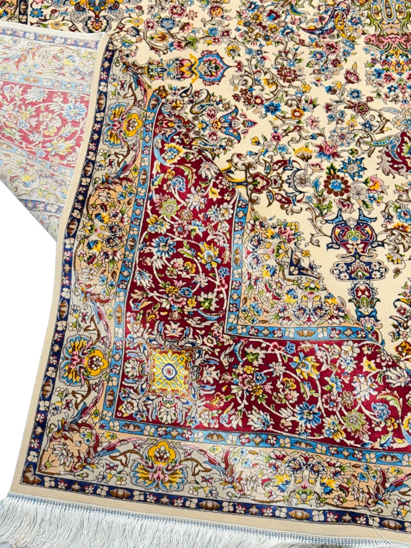 ربات بافت تبريز 250*350 مستطيل چلسي 50 رج کرک ابريشم با حاشيه ابريشم کرم الوان شرابي الوان 15 Kg