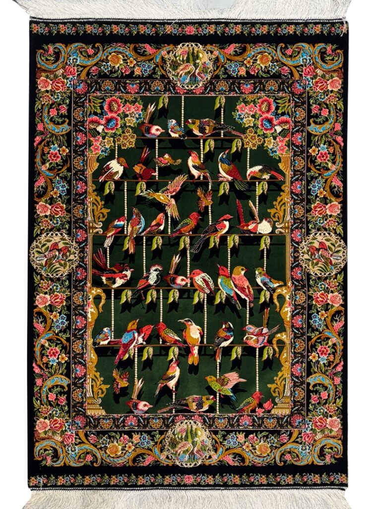 ربات بافت قم 80*120 مستطيل چهل طوطي 70 رج ابريشم و بنبوسيلک سبز الوان مشکي الوان kg1