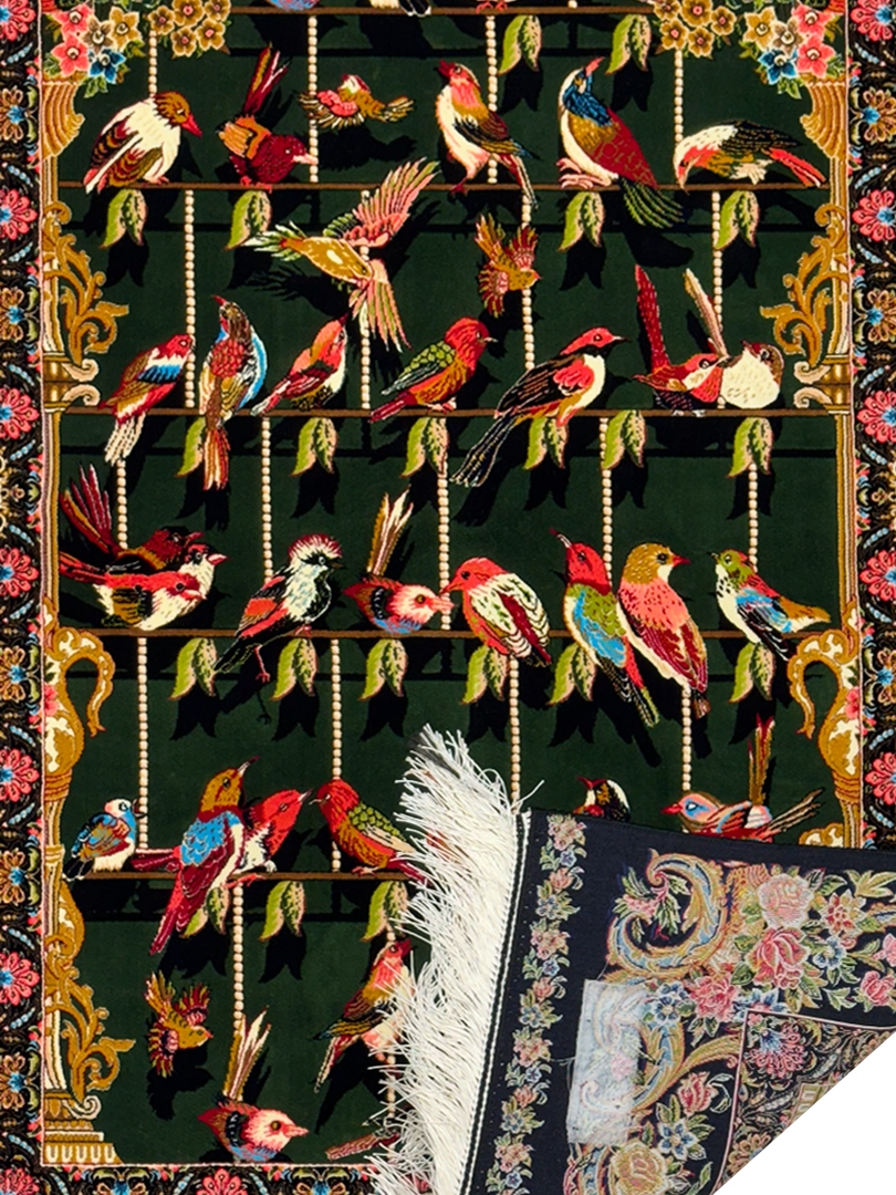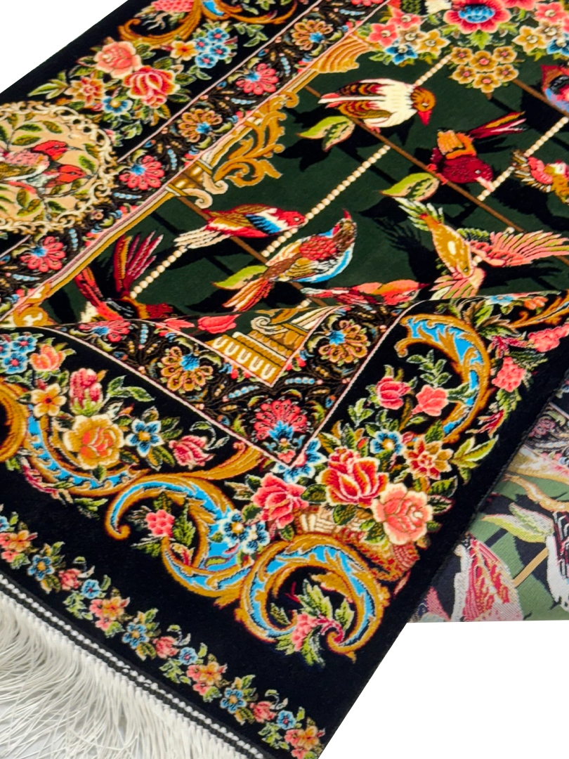 ربات بافت قم 80*120 مستطيل چهل طوطي 70 رج ابريشم و بنبوسيلک سبز الوان مشکي الوان kg1