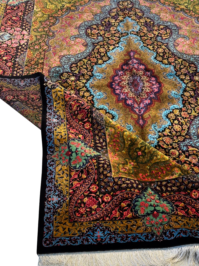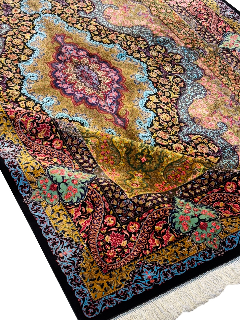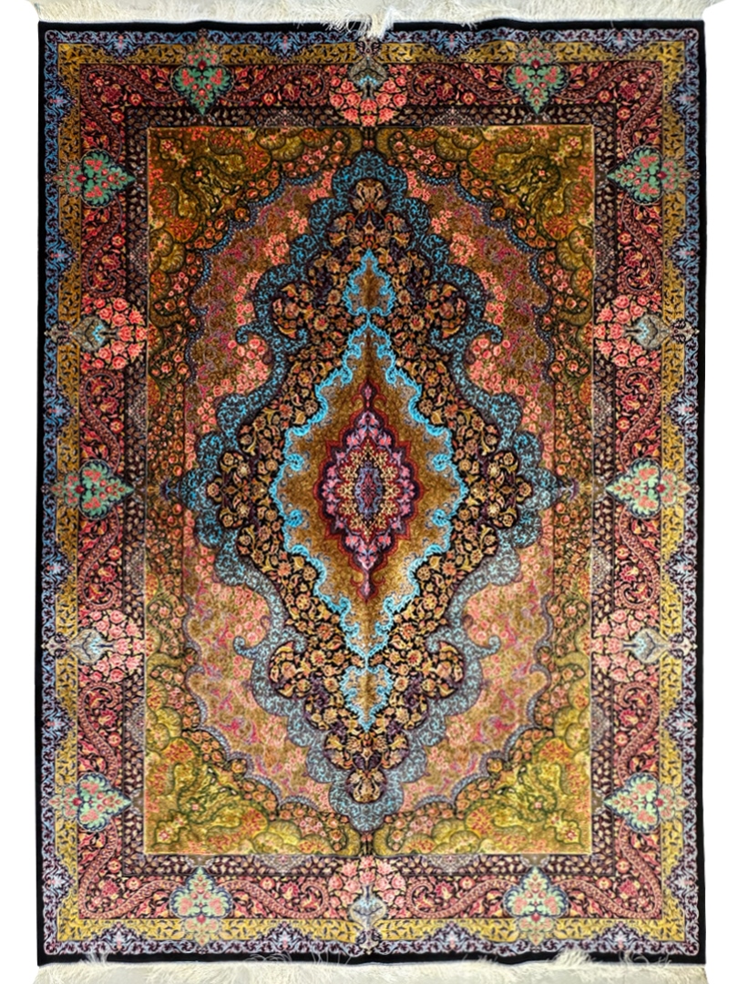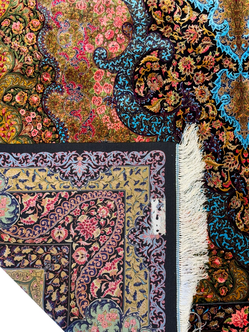 ربات بافت قم 200*300 مستطيل کاظمي 70 رج ابريشم و بنبوسيلک سورمه ايي الوان لاکي الوان 12 Kg